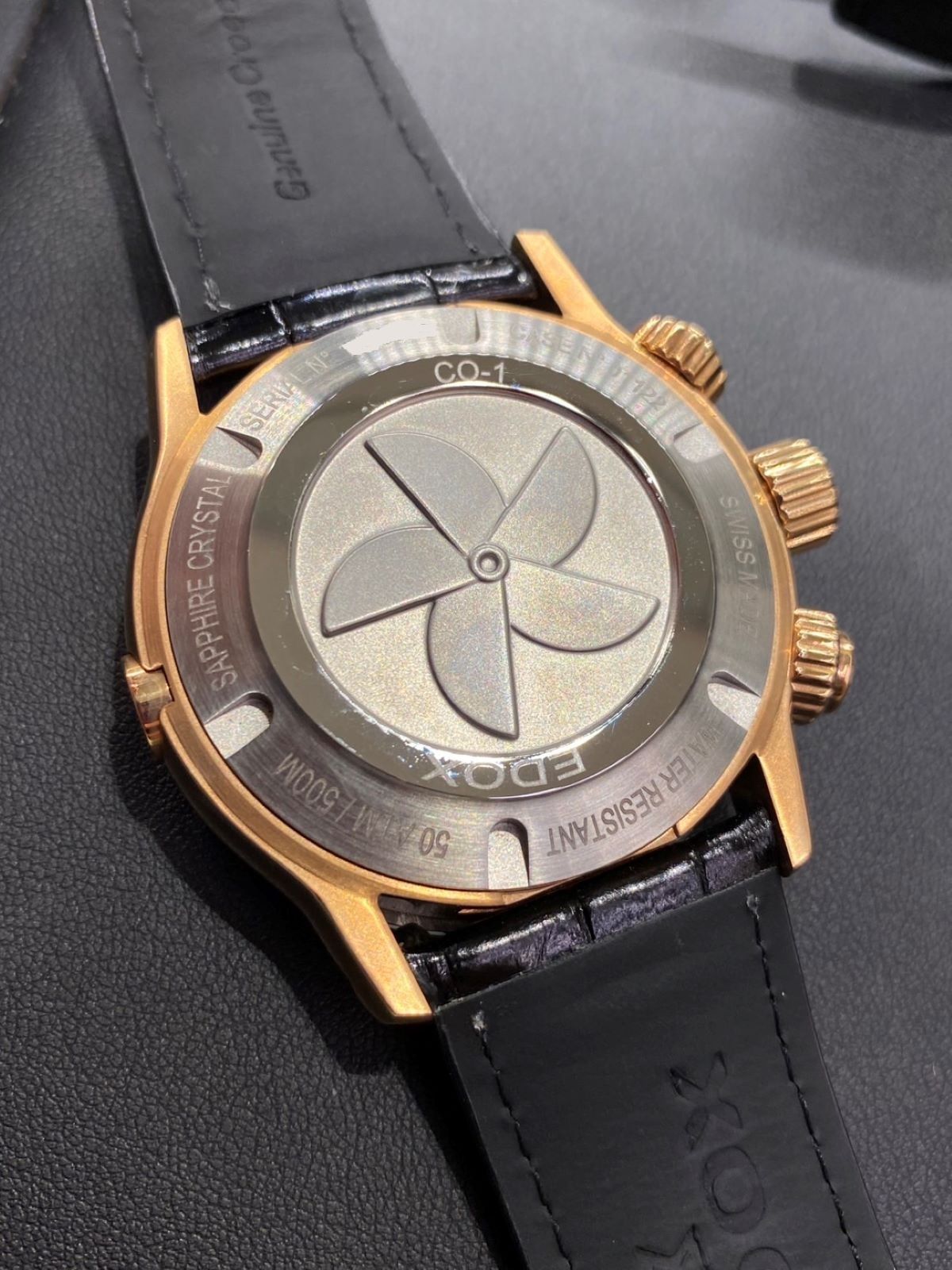 ケースバックはパワーボートのスクリューからインスピレーションを得たデザインとなっており