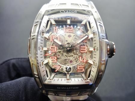 「クストス」最大の魅力でもある両面スケルトン仕様のダイヤルにはムーブメントだけに留まらず、オープン日付ダイヤルがデザインされ、