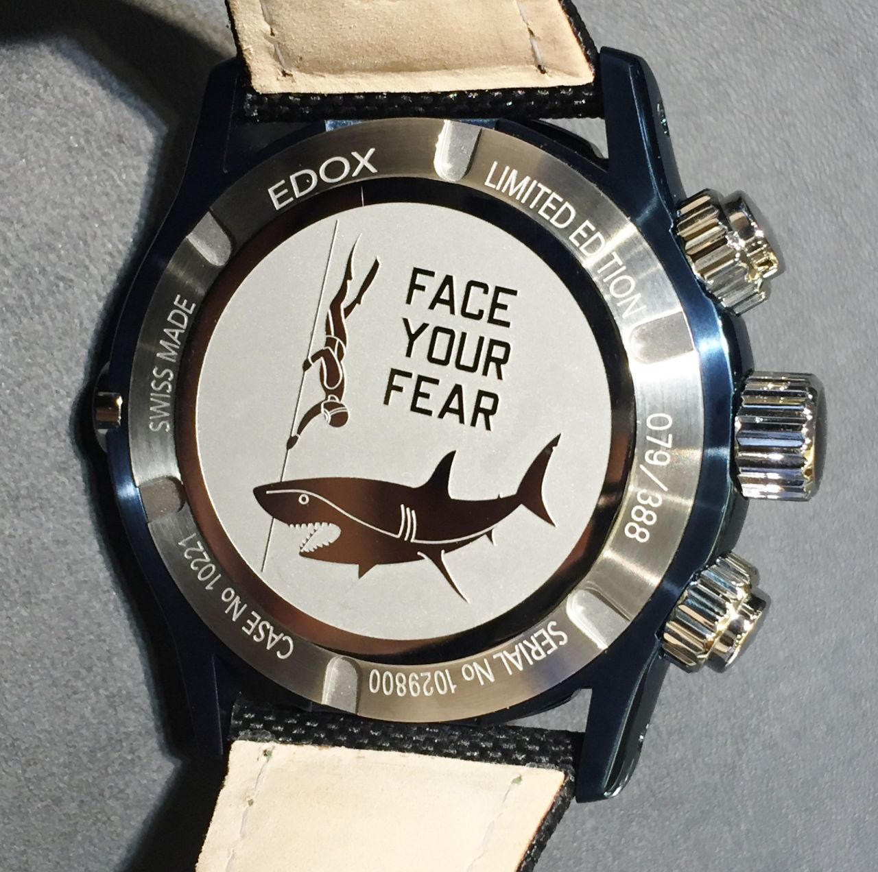 サメが描かれたケースバックには、限定ナンバーと“FACE YOUR FEAR”(困難や恐怖に立ち向かう)の文字が刻印されています。