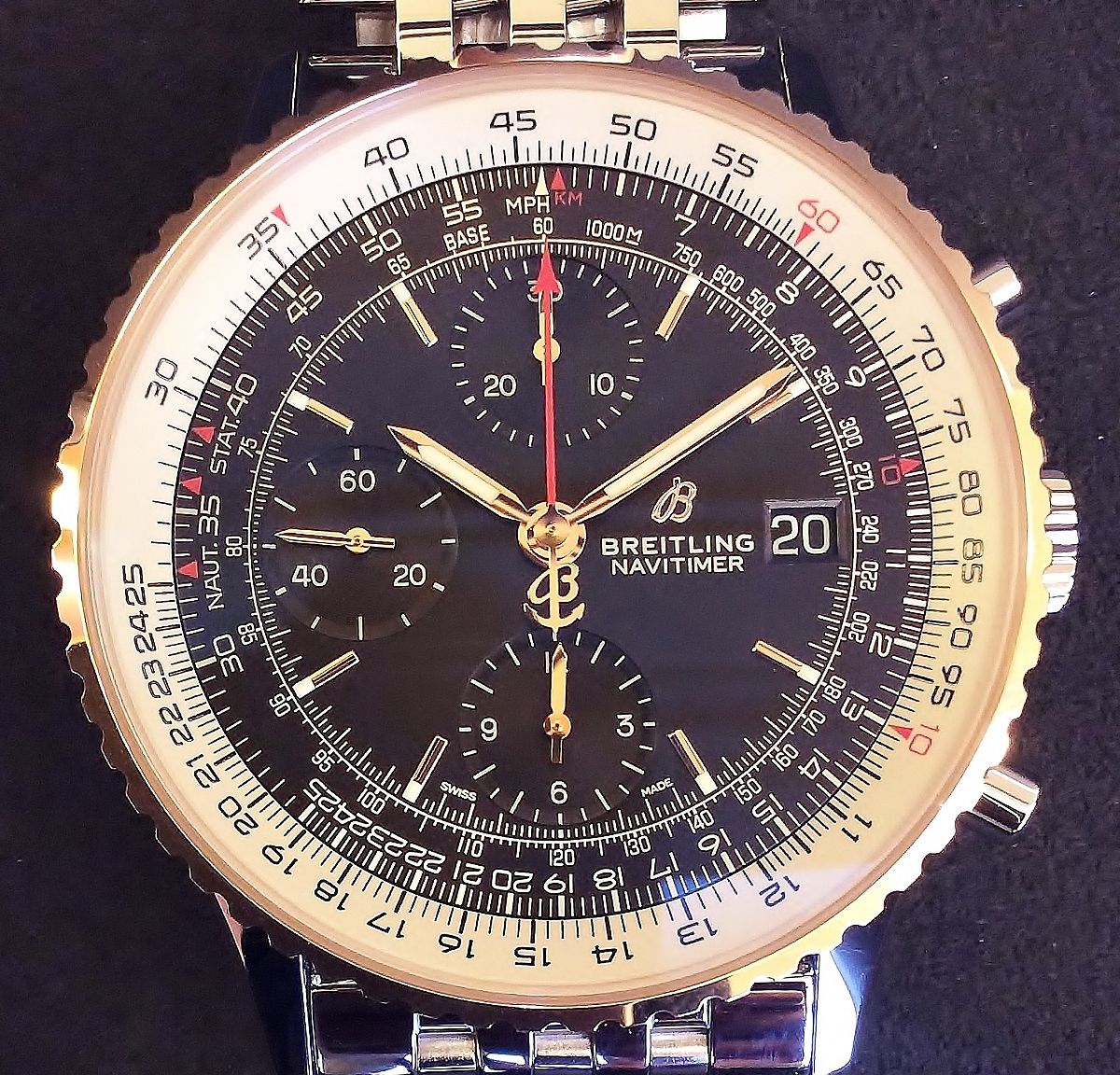 このモデルは回転ベゼルに18Kレッドゴールドを使用し、ケースはステンレススチール、サイズは41ミリ、18Kゴールドモデルの豪華さは有りながら、実用性にも富んだ小ぶりで魅力的なナビタイマーに仕上がっています!!