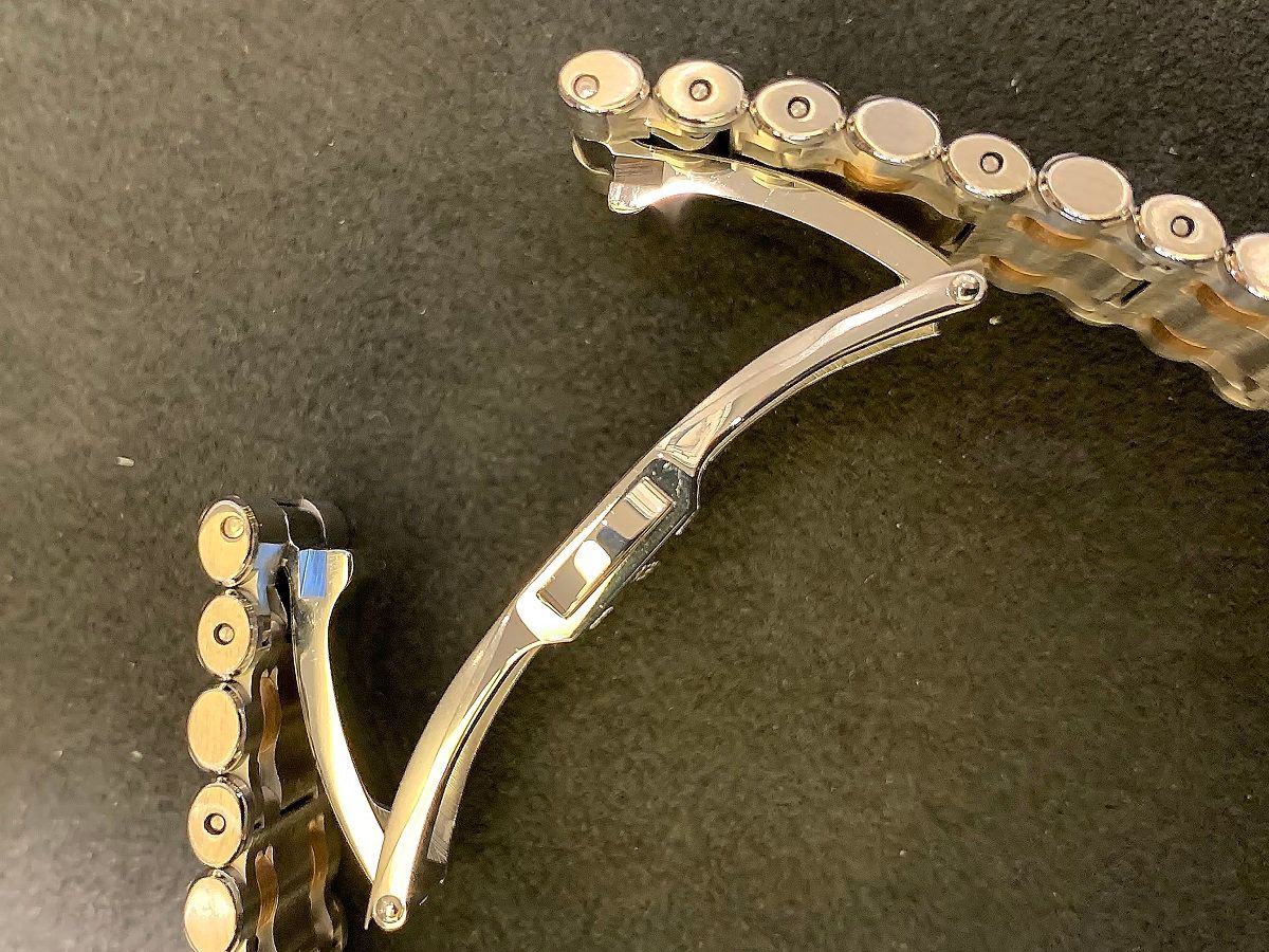 留め金はプッシュボタン式の両開きフォールディングバックルを採用し、容易に着け外しを行なって頂けます!!