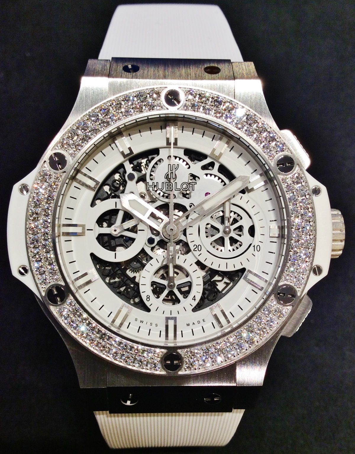 仕様:HUB4214 自動巻きスケルトンクロノグラフ、約42時間パワーリザーブ、ダイヤモンド114個(約1.70cts)、無反射コーティングサファイアガラス、10気圧(100m防水)。