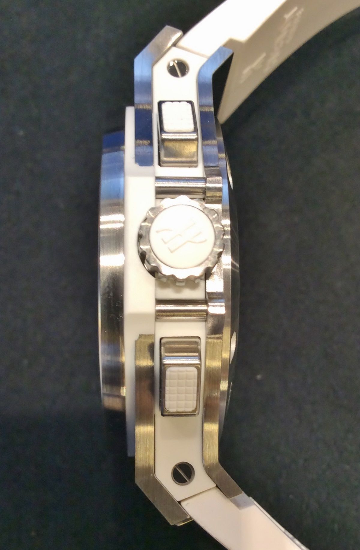 また、装着感にもこだわったホワイトラバーのしなやかさとH型バックルは皆様に時計装着の煩わしさは与えません!!