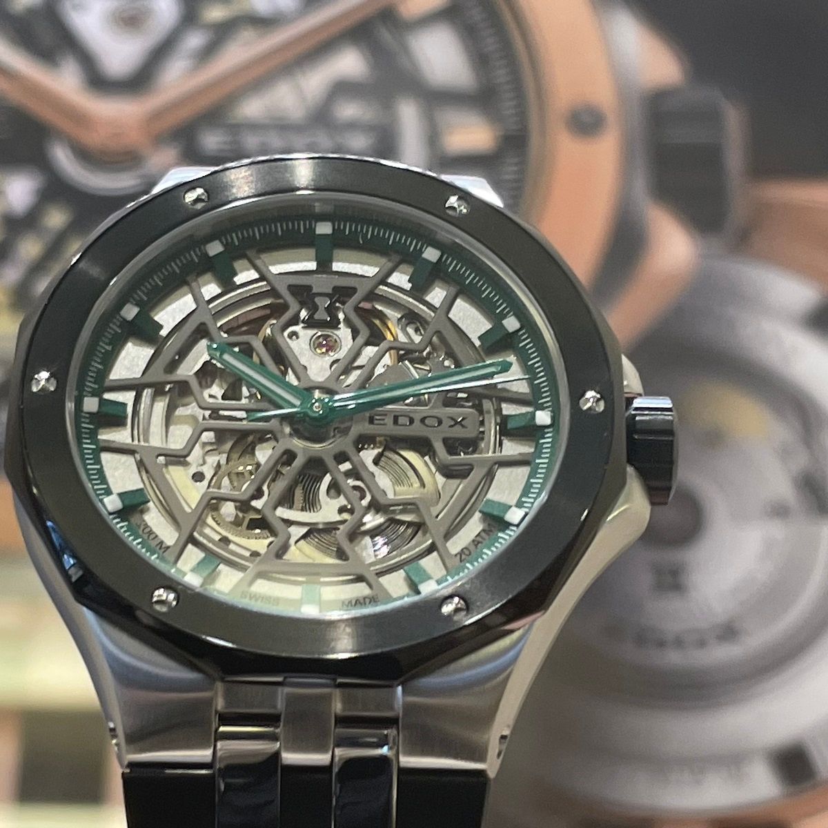 デルフィンメカノの特徴でもあるスケルトンに、EDOXエンブレムの砂時計をイメージした文字盤の模様に加え、内部のテンプやガンギ車など時計の内部がしっかりと見える構造はとても格好いいですよね☆!!