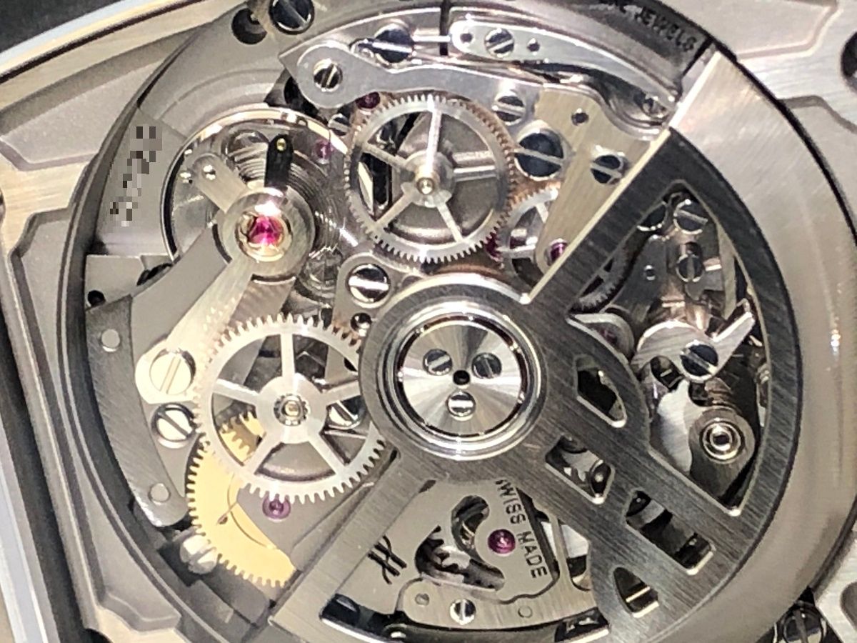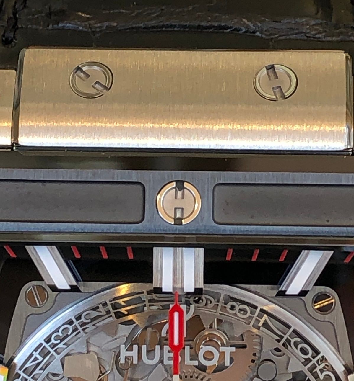 パーツをつなぎ留める役割以外にも、一目でウブロと分かる特徴となっているビスですが、こちらもよく見るとウブロ(HUBLOT)の頭文字のHの形になっていますね!