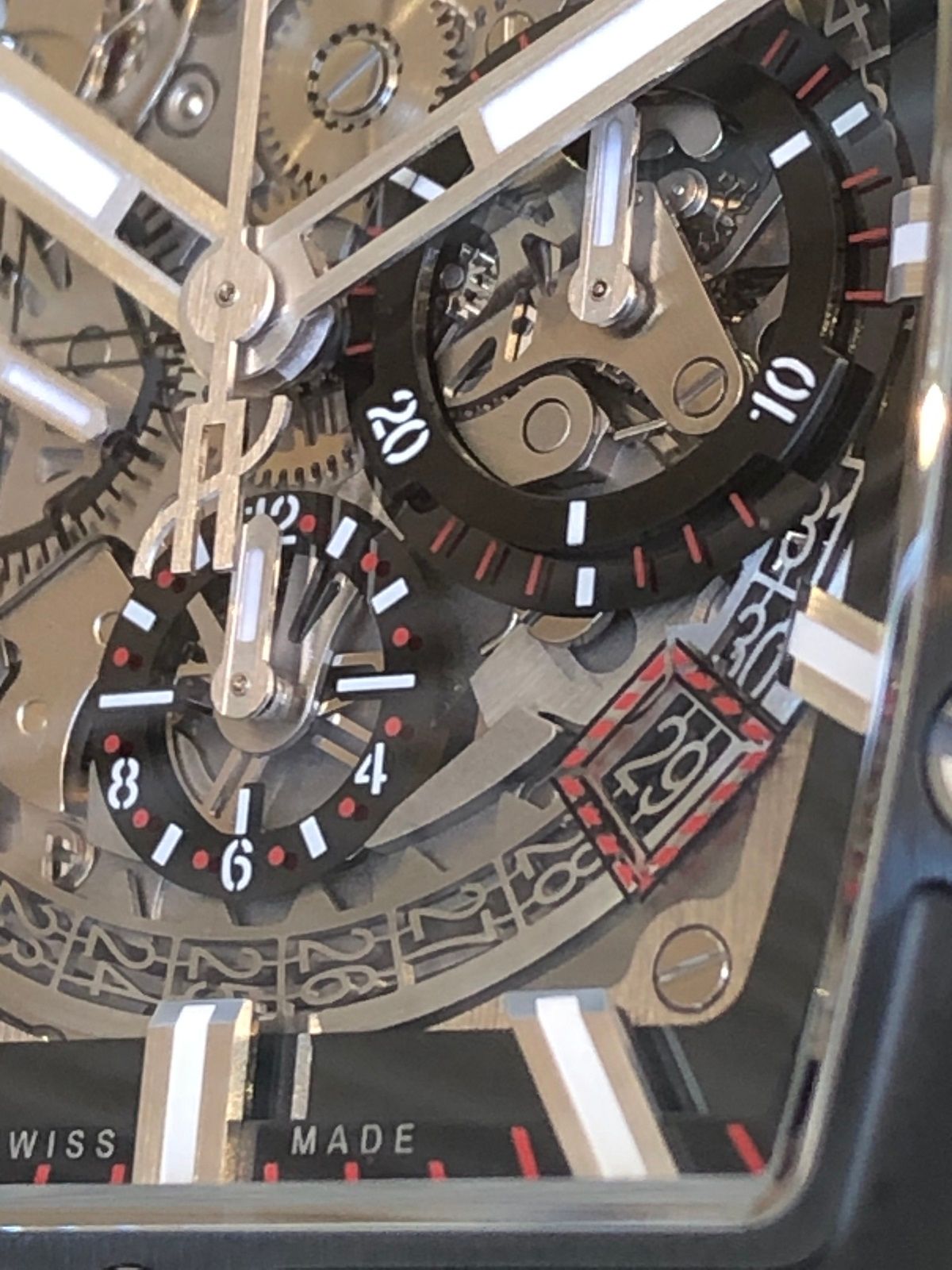スピリット オブ ビッグ・バン登場以降、カレンダーディスクがプリントからくり抜き加工に変更されたことで立体的な文字盤に溶け込み、より一体感が生まれました。