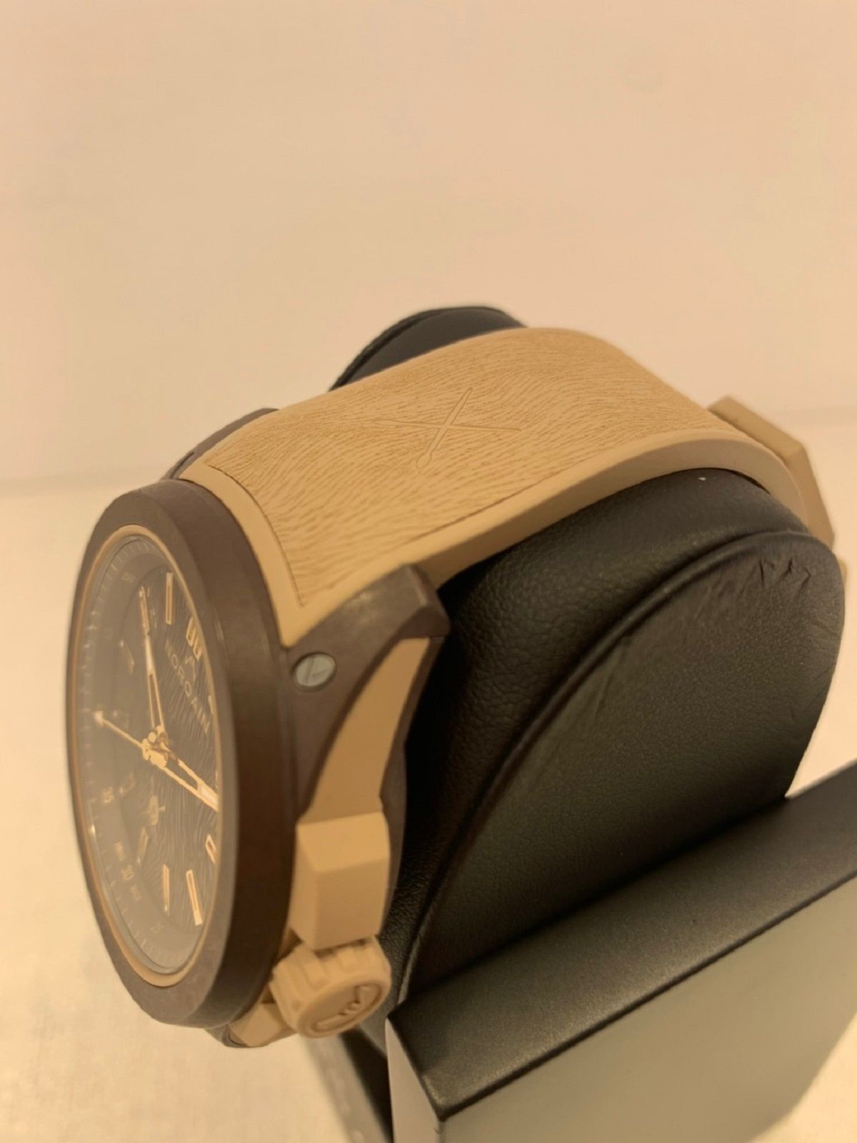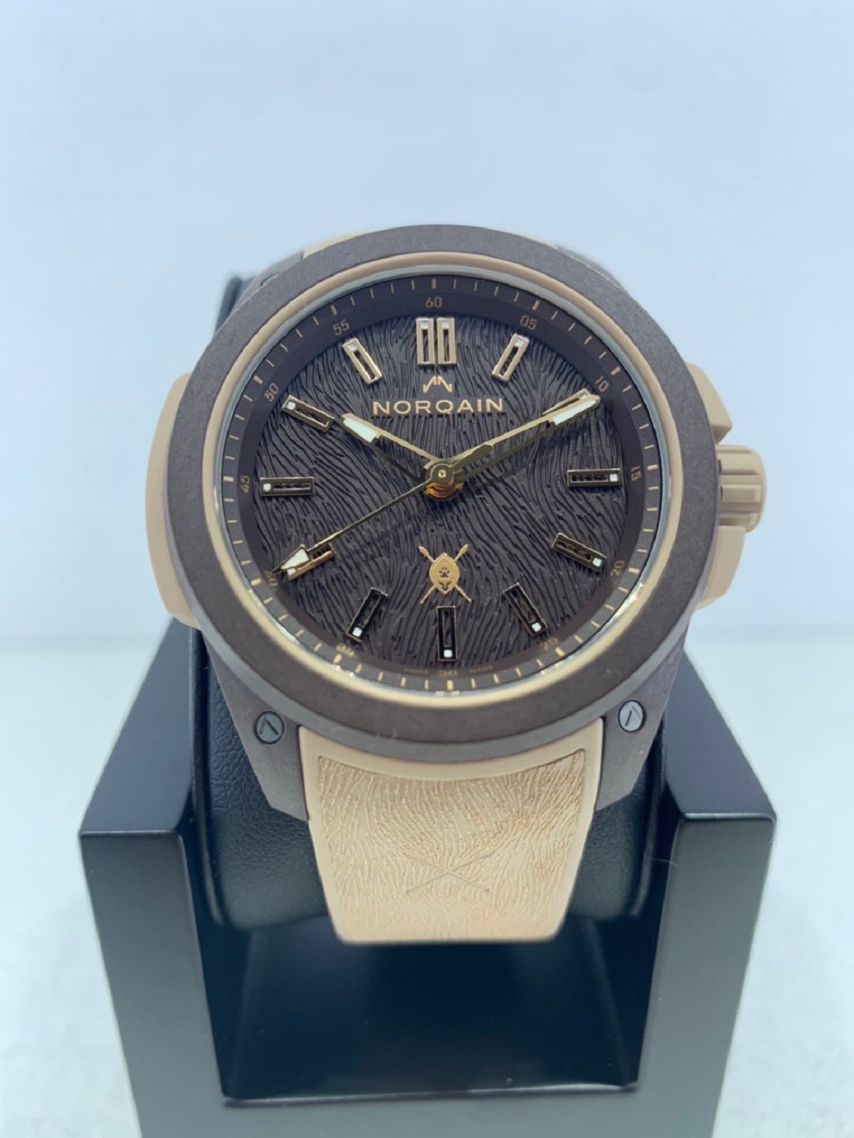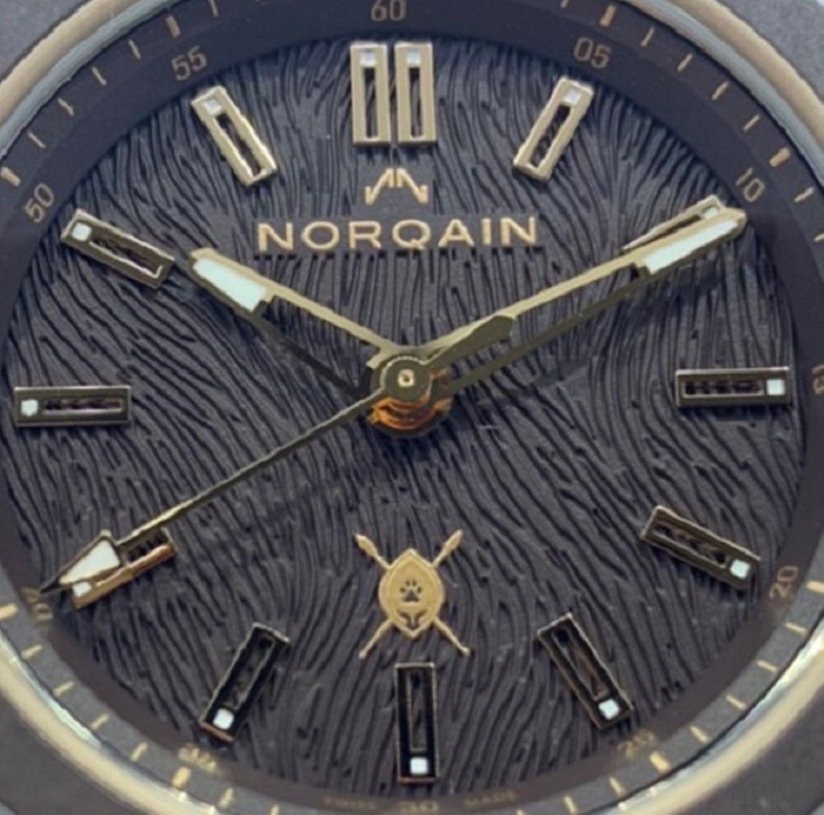 ゴールドブラウンの文字盤は、ライオンの毛並模様と保護区の槍と盾のロゴが刻まれ、細部を見れば見るほどこだわりを感じていただけるデザインです!
