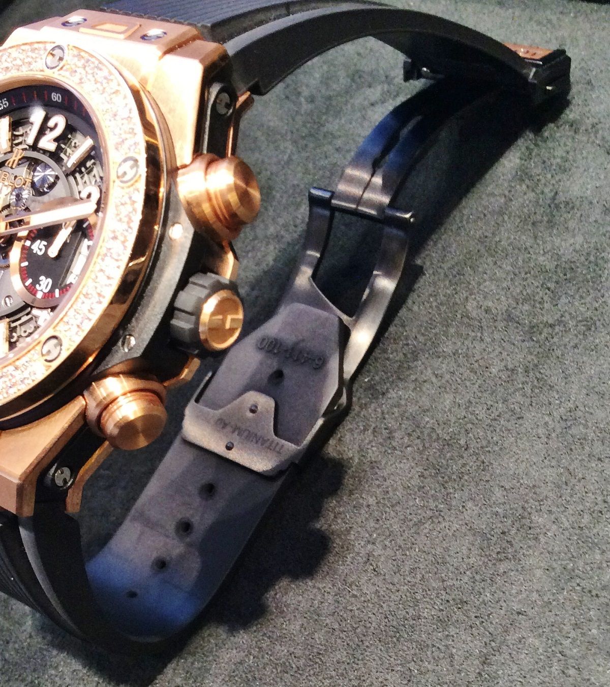 仕様:HUB1242 UNICO(自動巻きクロノグラフコラムホイール式フライバック ムーブメント)、72時間パワーリザーブ、反射防止加工を施したサファイアクリスタル、ブラック ラバーストラップ、18Kキングゴールド インサート付きブラックPVD加工チタニウム製フォールディングバックル・クラスプ。