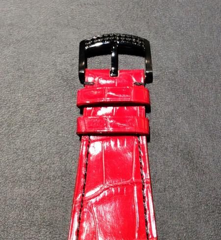 このモデルに特別に付けられた赤のアリゲータバンドは尾錠仕様となっており、その尾錠部にはケースに取り付けられたブラックダイヤモンドと同じ物が取り付けてあり、細部までこだわった作りが見て取れます!!