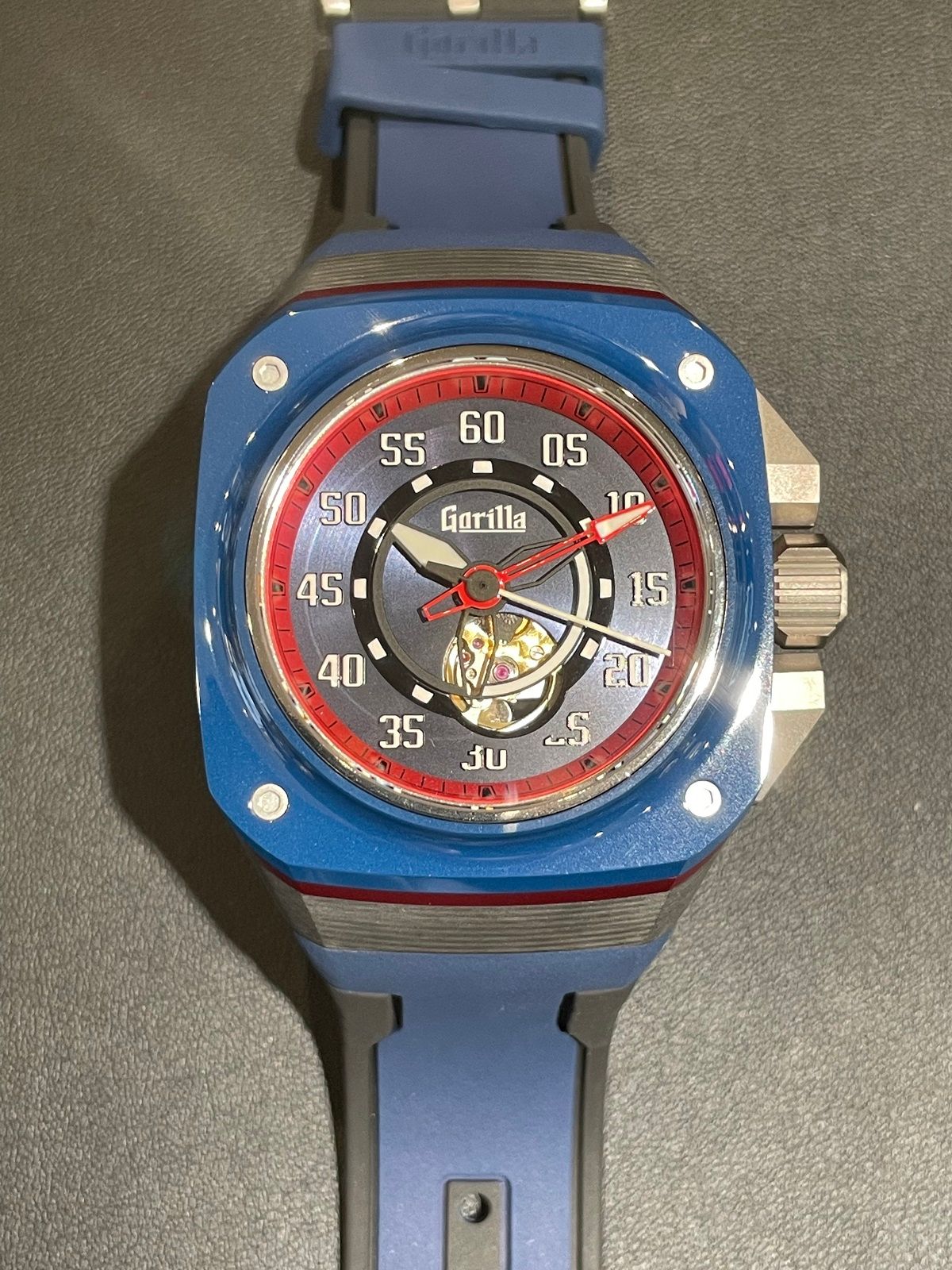 とある反骨精神にありふれたエネルギッシュなカラーリングが特徴のモデルで、ディープブルーの鏡面仕上げのセラミックベゼルに多層仕上げのフォージド・カーボンの間にあるピンストライプや、文字盤など各所に配させているレッドがアクセントになっていてとても格好良いですよね☆‼