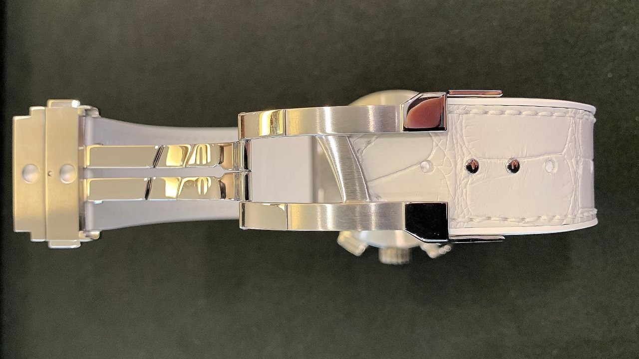 ストラップでは表は白色のアリゲーターレザーを使用し、裏側は白色ラバーバンドになっている為、レザーストラップが苦手な方でも、着用しやすい作りになっているのも魅力その6!!
