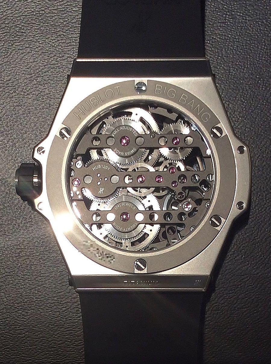 仕様:HUB1201(手巻きスケルトンムーブメント)、反射防止加工を施したサファイアクリスタル、ライン入りラバーバンドにフォールディングバックル、10気圧防水
