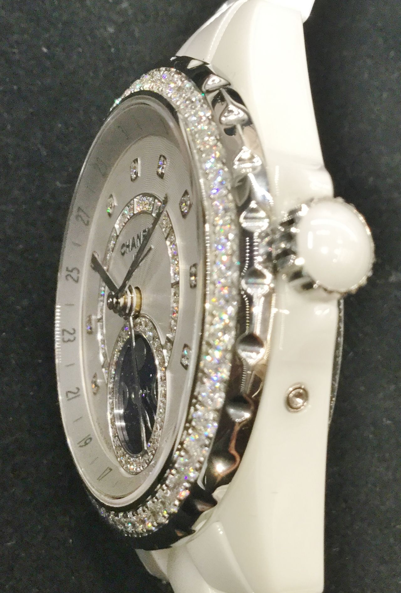 サイドから見てもハイテクホワイトセラミック、ステンレススティール、ダイヤモンドとそれぞれの素材が一体感があり、どの角度から見てもバランスの良さが窺えます。
