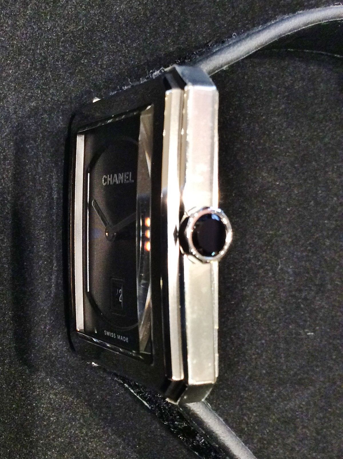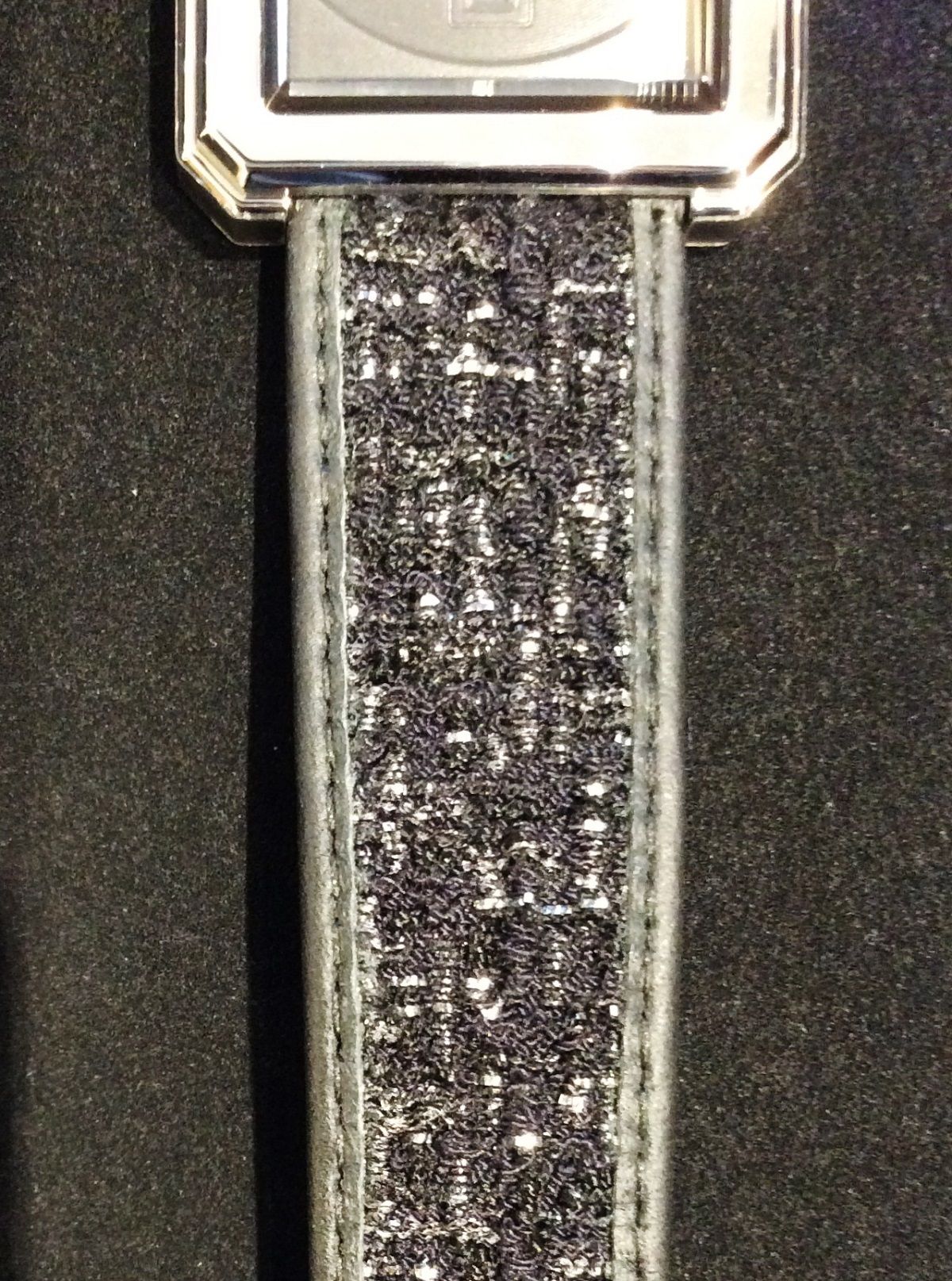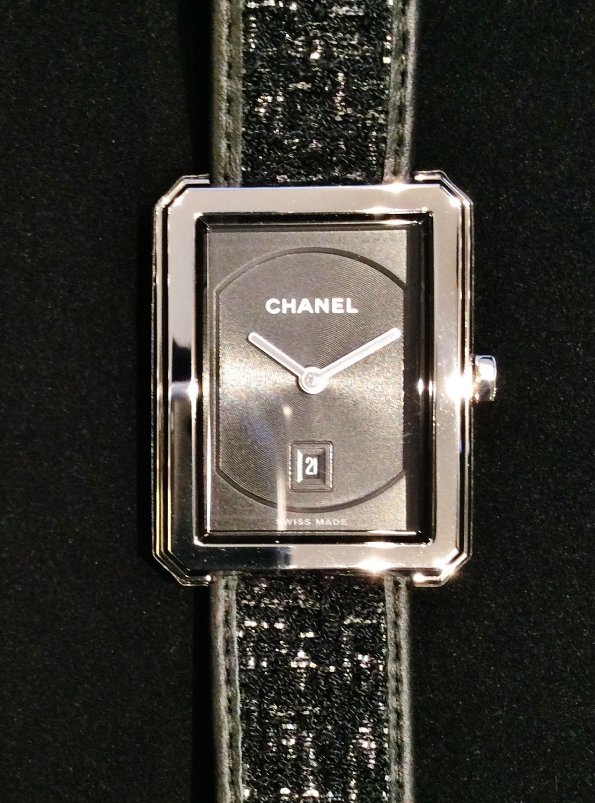 バンドは中央にブラックとシルバーを織り交ぜたシャネルツイードに両端をレザーでトリミングし、バンド自体がシャネルツイードジャケットを思わせる仕上がりになっています。