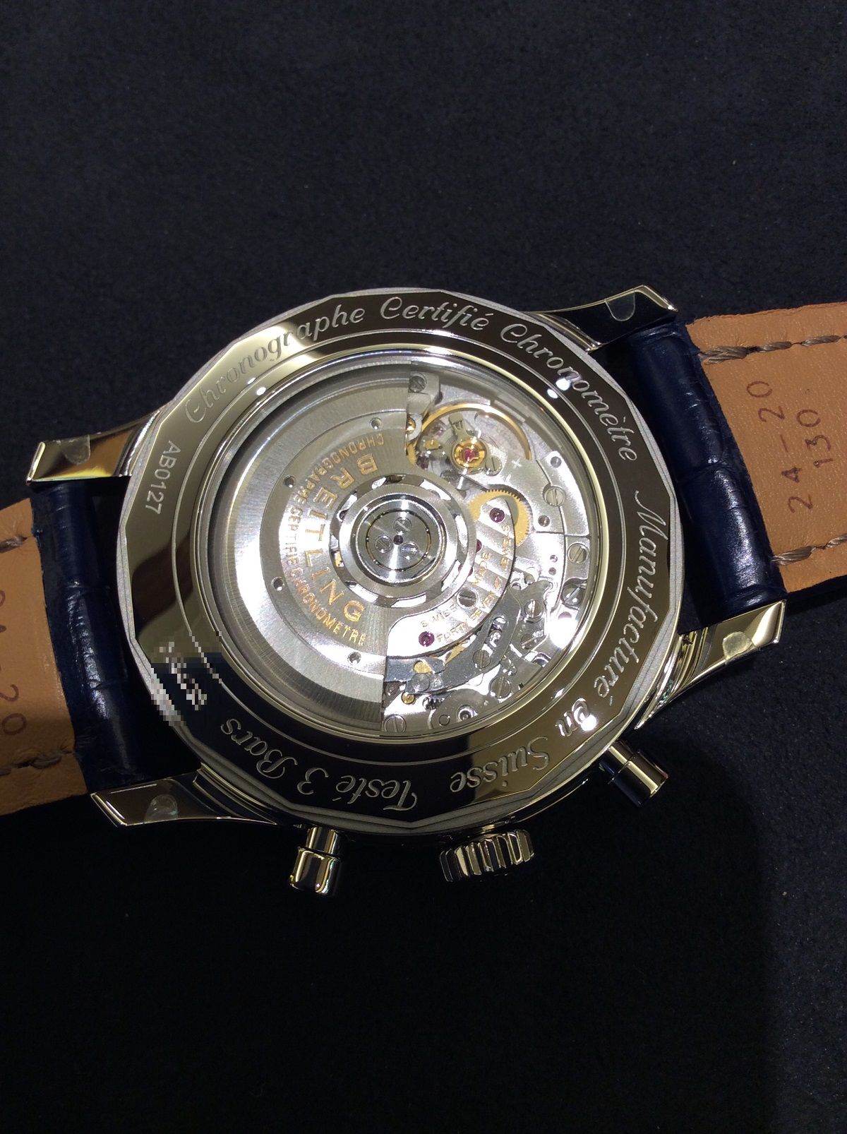 仕様:自社キャリバーB01搭載、パワーリザーブ約70時間、ドーム型両面無反射コーティング済みサファイアクリスタル、回転計算尺付き