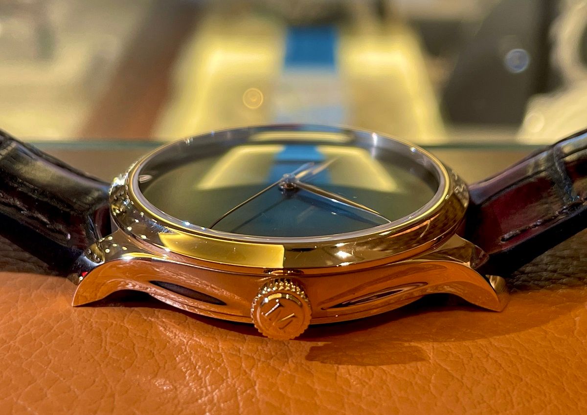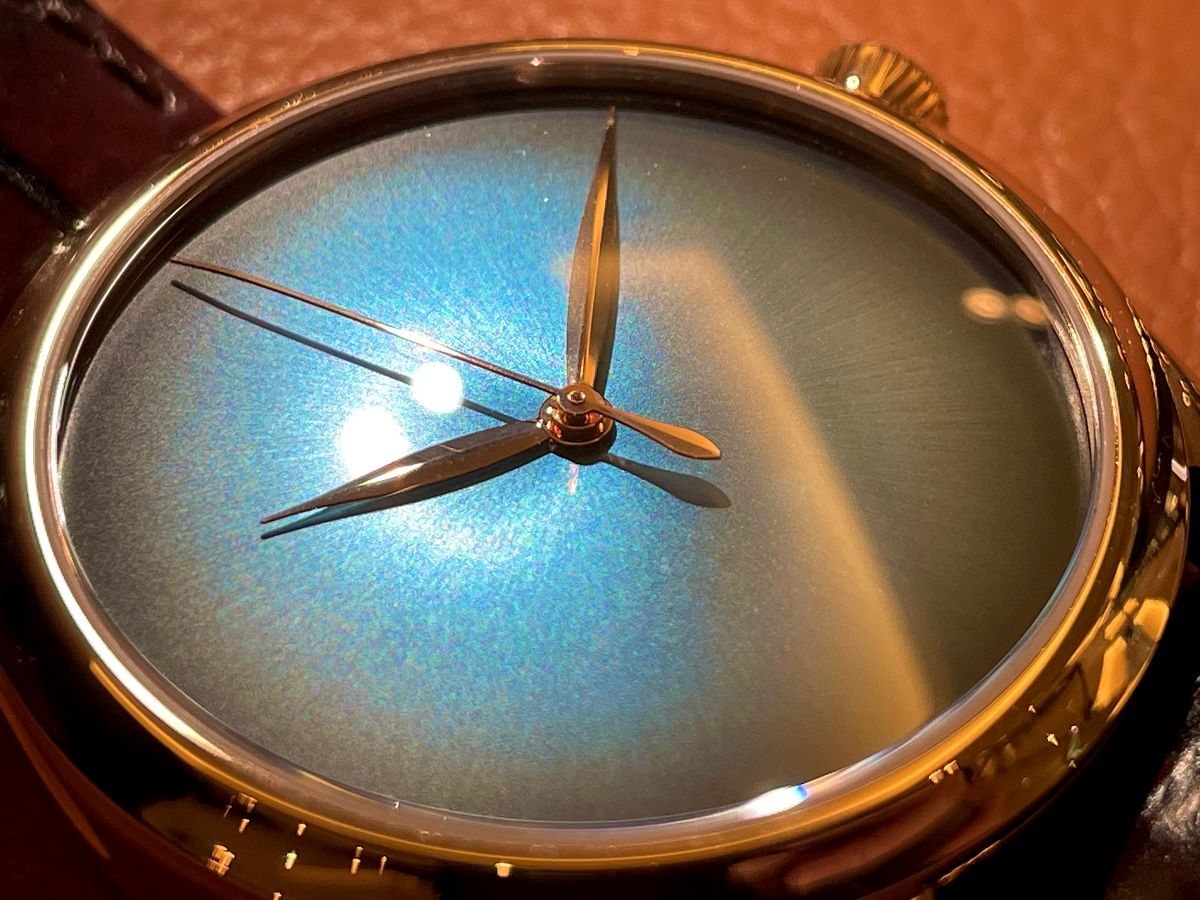 ブランドロゴすら無い、まさにシンプルを極めフュメダイヤルと呼ばれる絶妙なグラデーションのラッカー文字盤を採用しています。