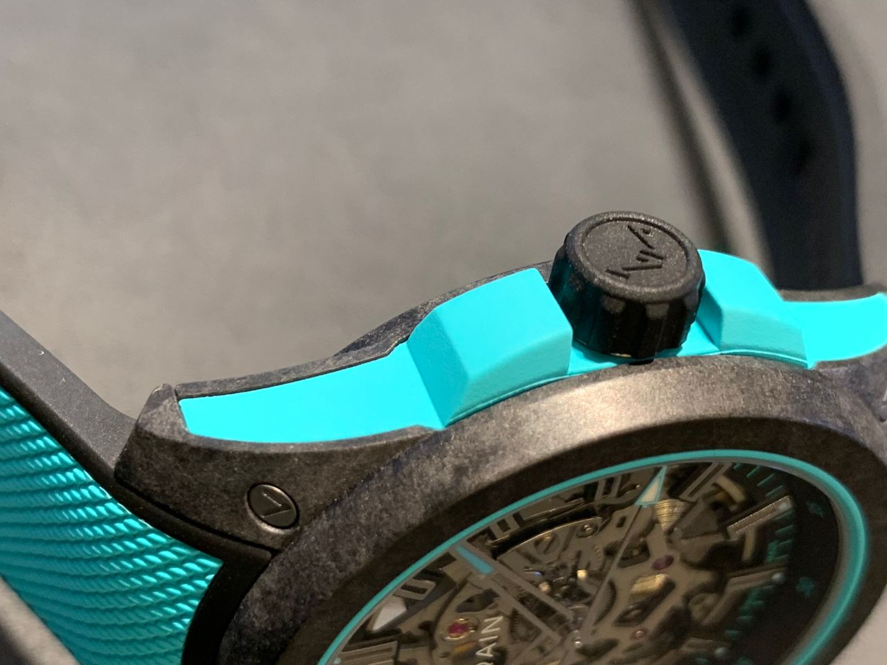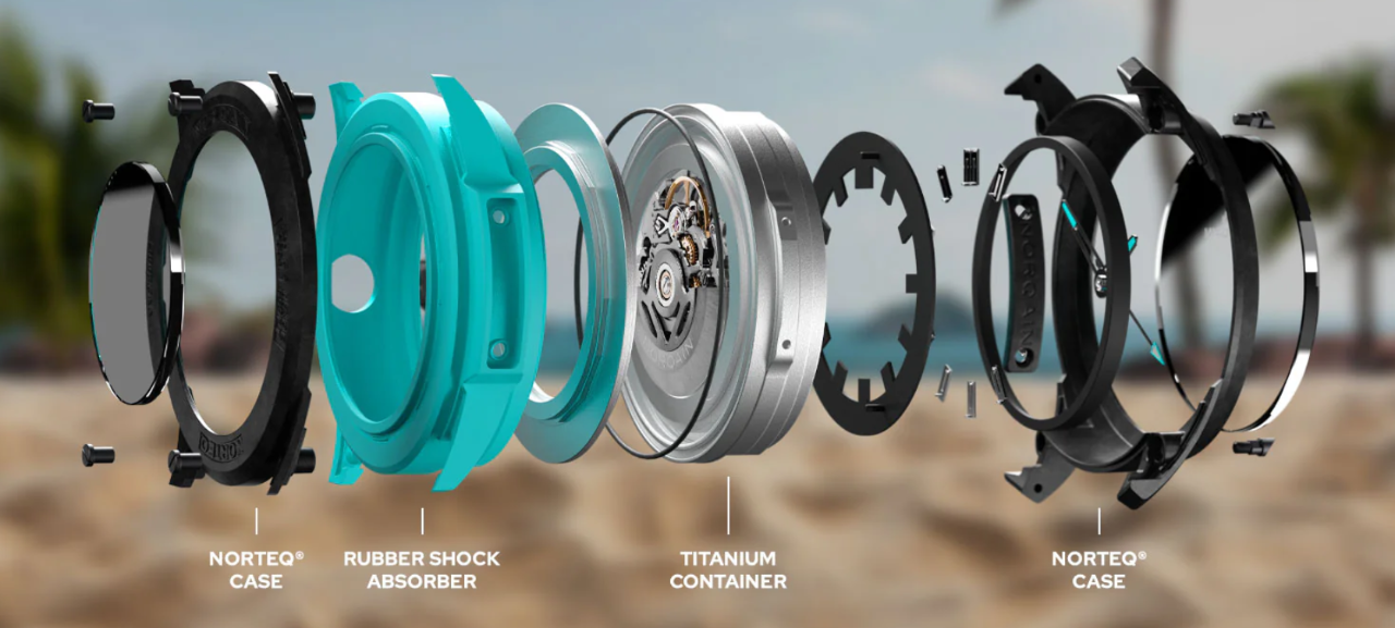 「WILD ONE」のケースには25個のパーツが使われ、チタン製のコンテナに収められたムーブメントをショックアブソーバーで包む構造になっています。その結果、機械式時計の弱点である「衝撃」に対し、耐久性を備えています!