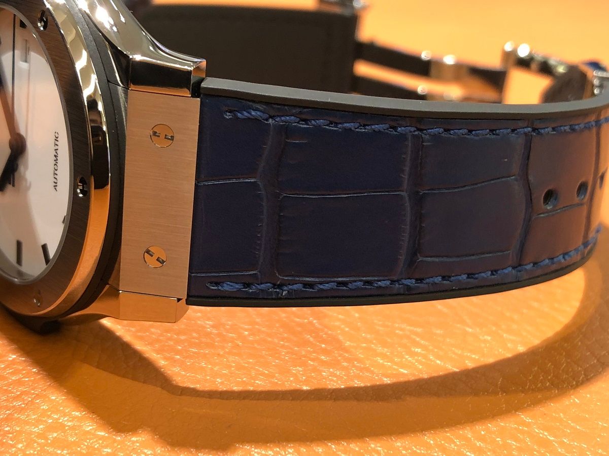 表側がブルーアリゲーターストラップなのですが、裏側がラバー素材なので汗にも強く快適に着けていただけます。
