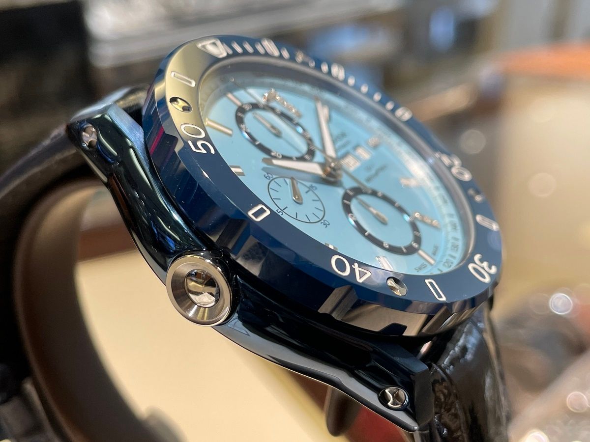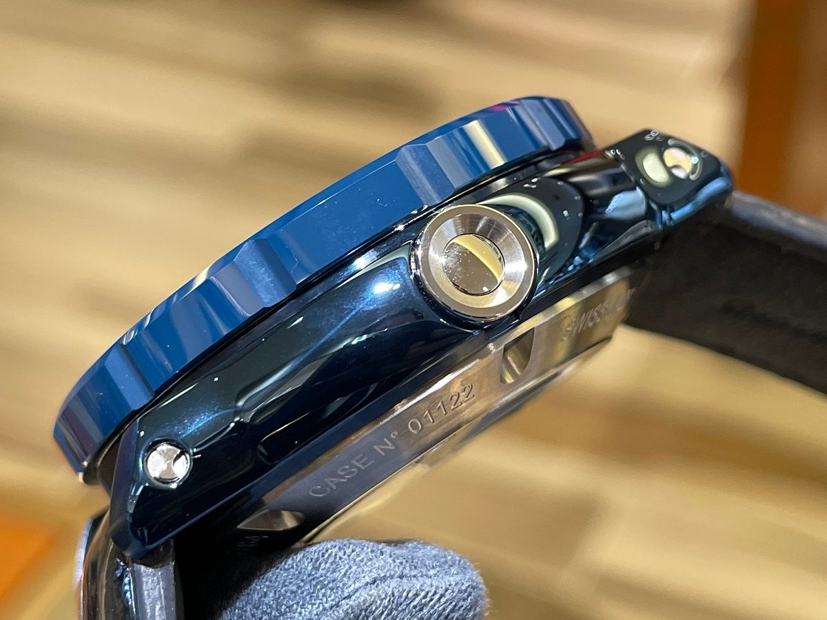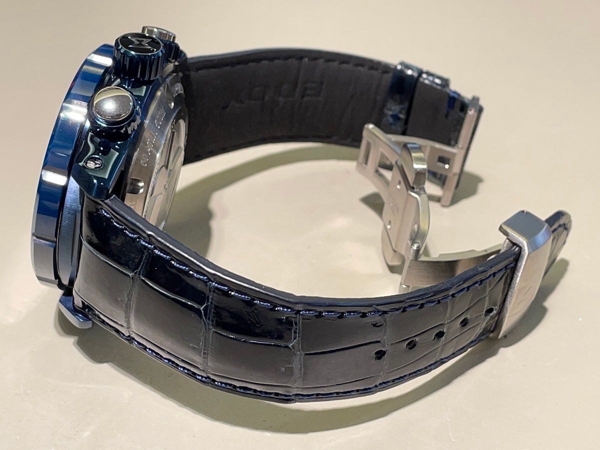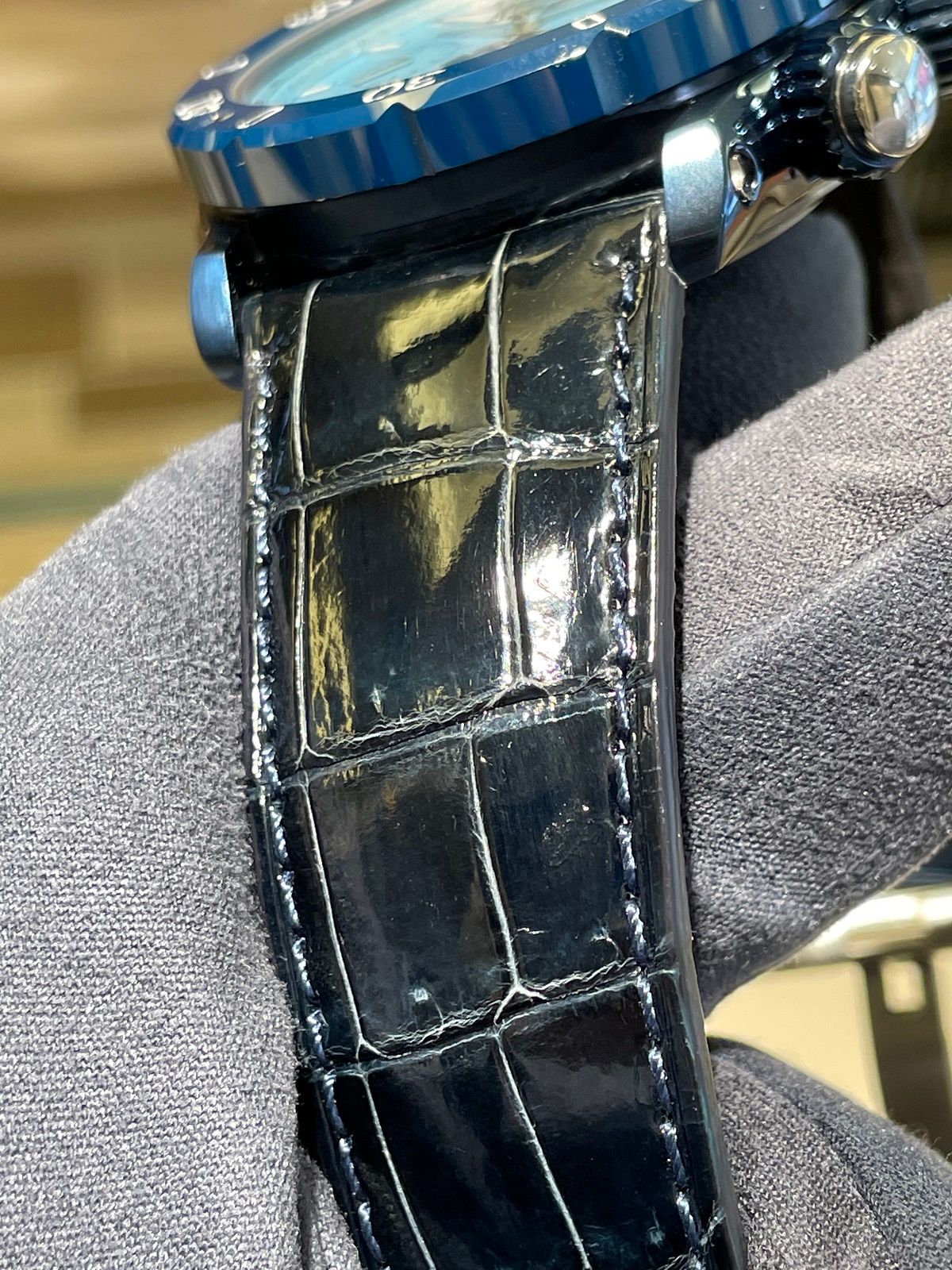 深い深いブルーのクロコダイルストラップもお洒落ですね!