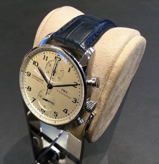 クロノグラフの機能が付いていますが、複雑すぎずスポーティでエレガントな顔立ちになっております。