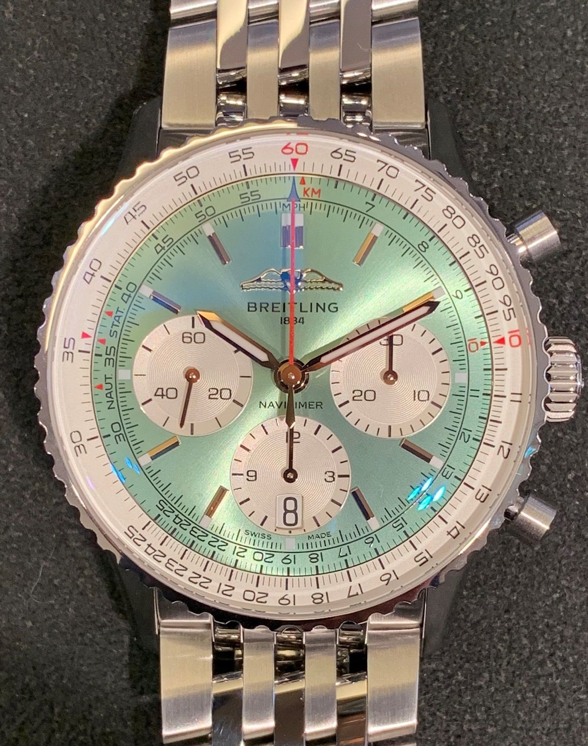 ナビタイマーでは、視認性の観点からも黒や青などどちらかと言うと濃い色の文字盤カラーが採用されてきましたが、今回のナビタイマーリニューアルに合わせて、今までに無い魅力的なカラーが多く登場、その中でも今回ご紹介のグリーンは、男性、女性問わず楽しんで頂けるカラーのひとつ‼