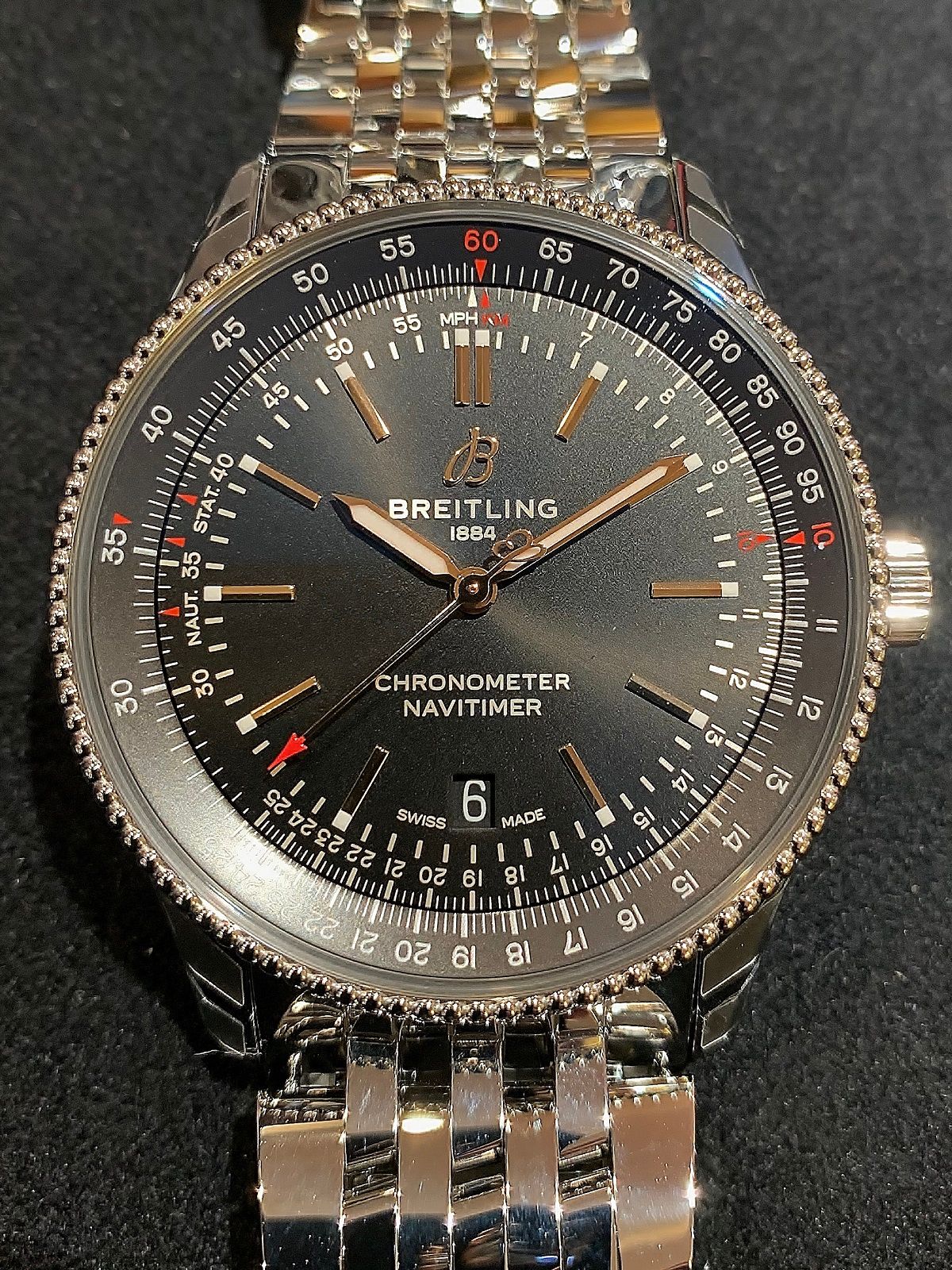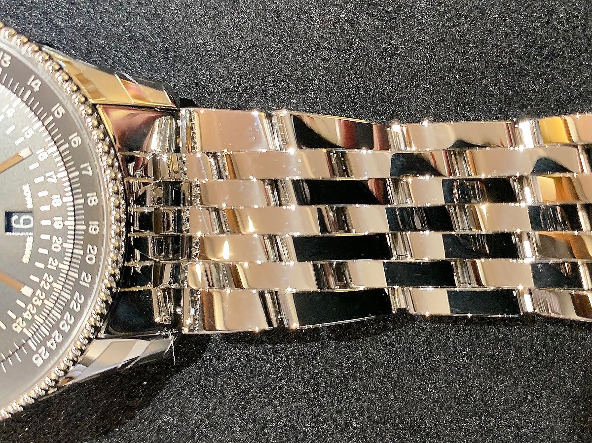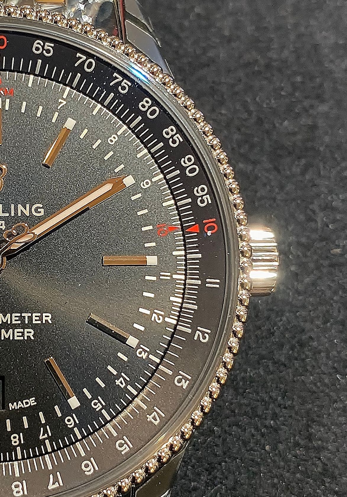 皆様もよくご存じのナビタイマーは①回転計算尺、②クロノグラフ搭載、③スモールセコンド、④7連ブレスレット⑤ケースサイズ46ミリや43ミリが主流など目立った特徴がありますが、今回ご紹介のナビタイマーオートマチックでは、先に挙げさせて頂いたディテールがないものがあり、今までのナビタイマーの印象、ブライトリングの印象をいい意味で裏切り、選択肢を増やせた意欲作!!