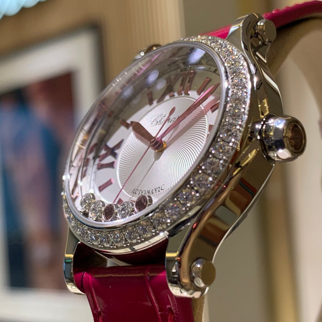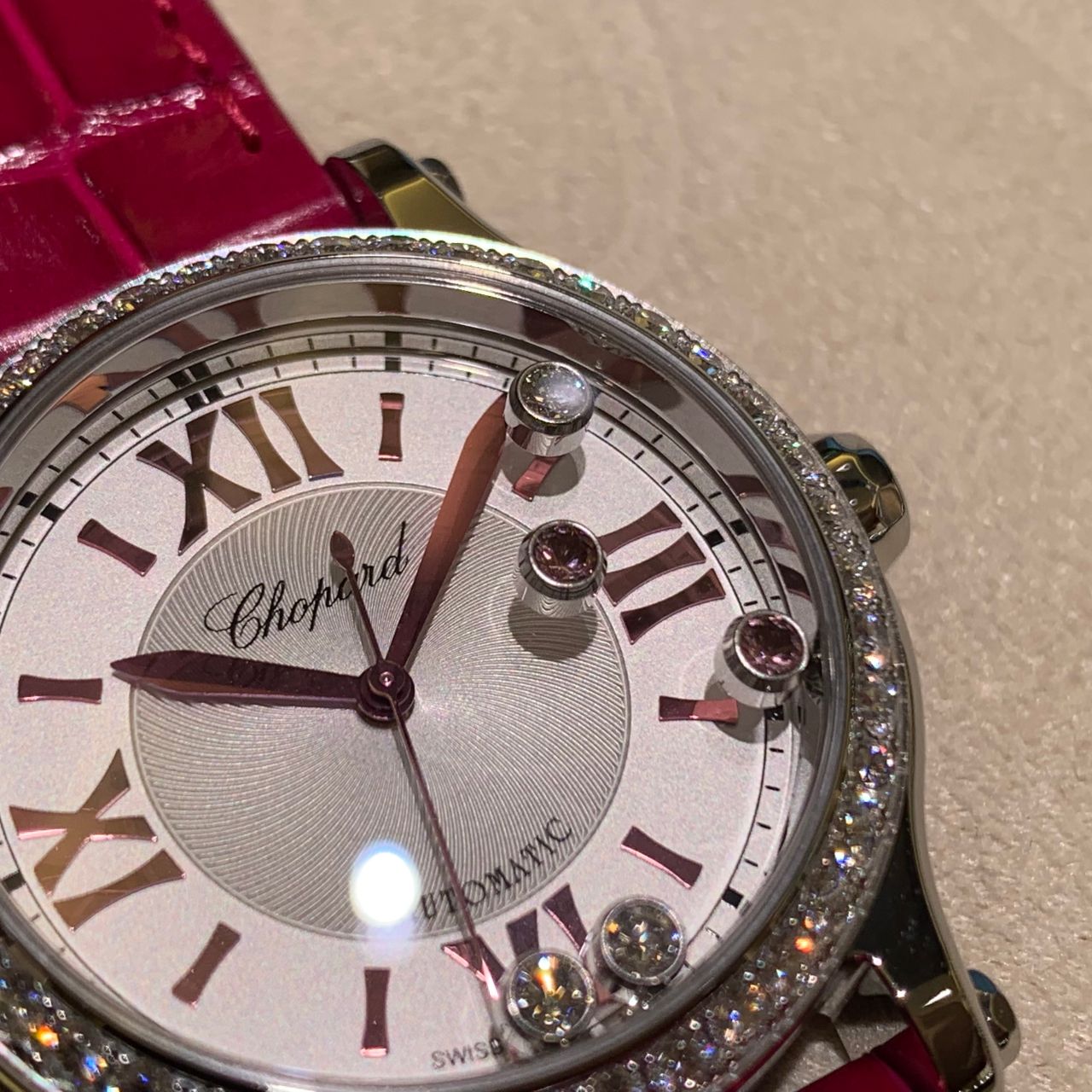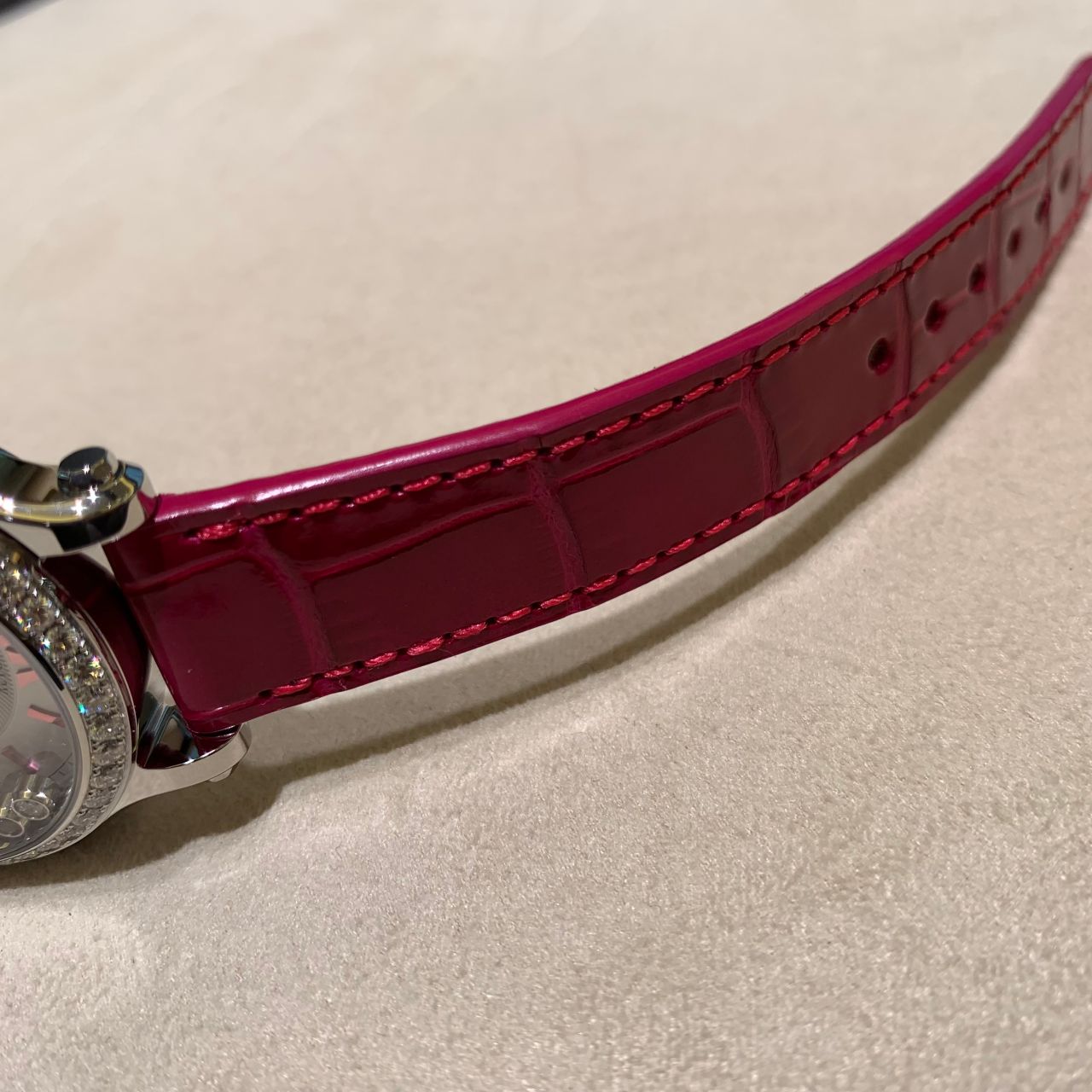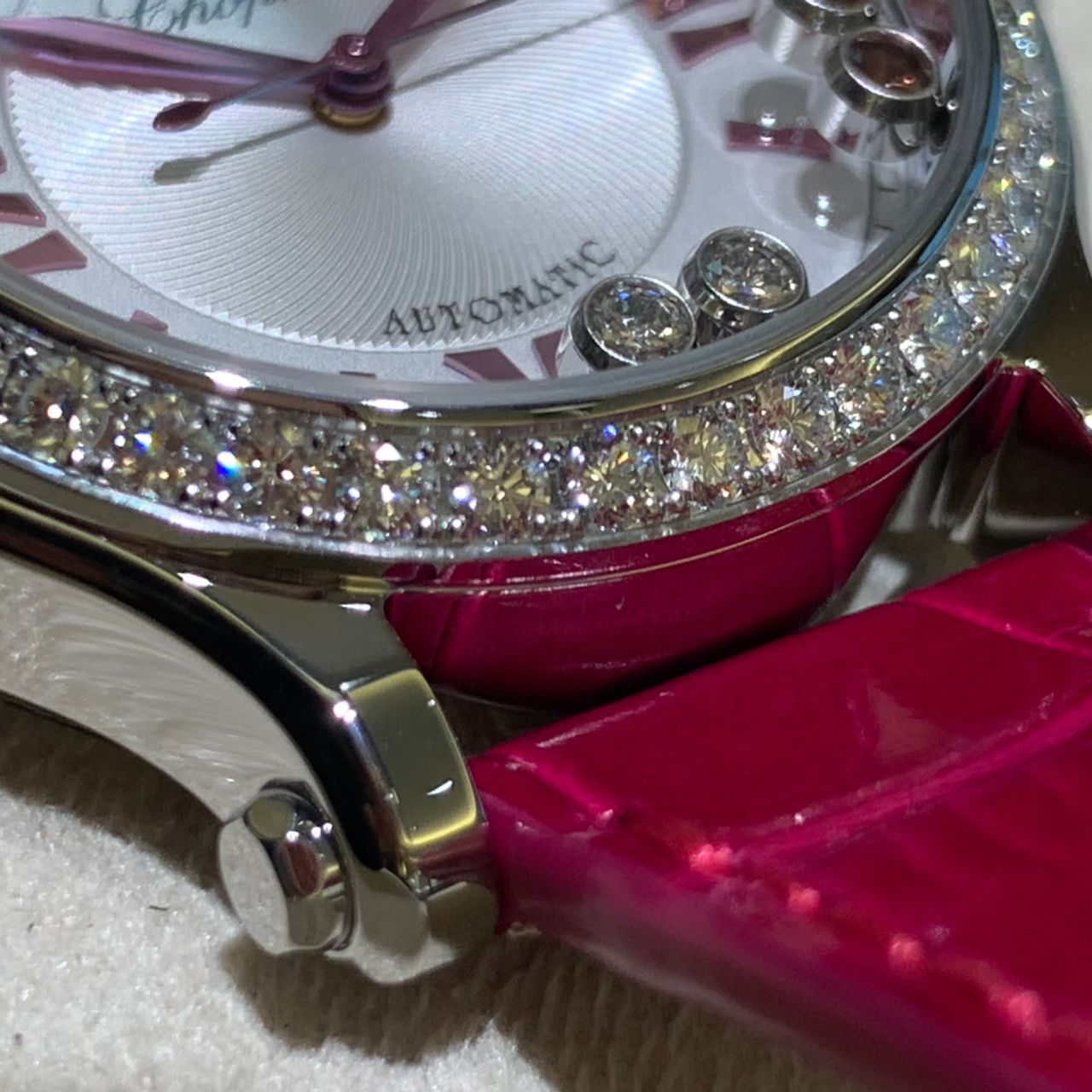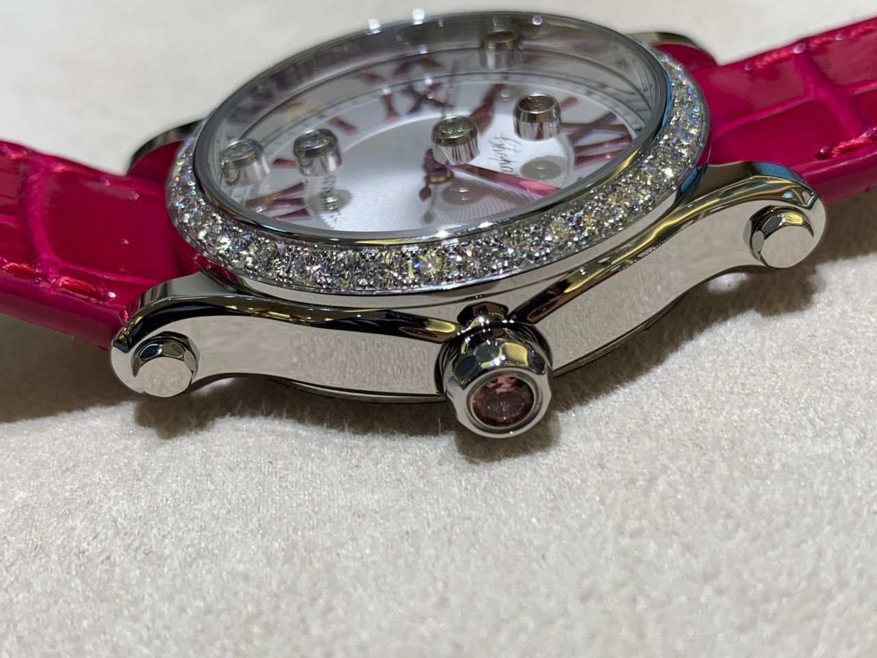 鮮やかなピンクカラーが目を惹きます!ベゼル周りにダイヤモンドをあしらった贅沢な1本です!