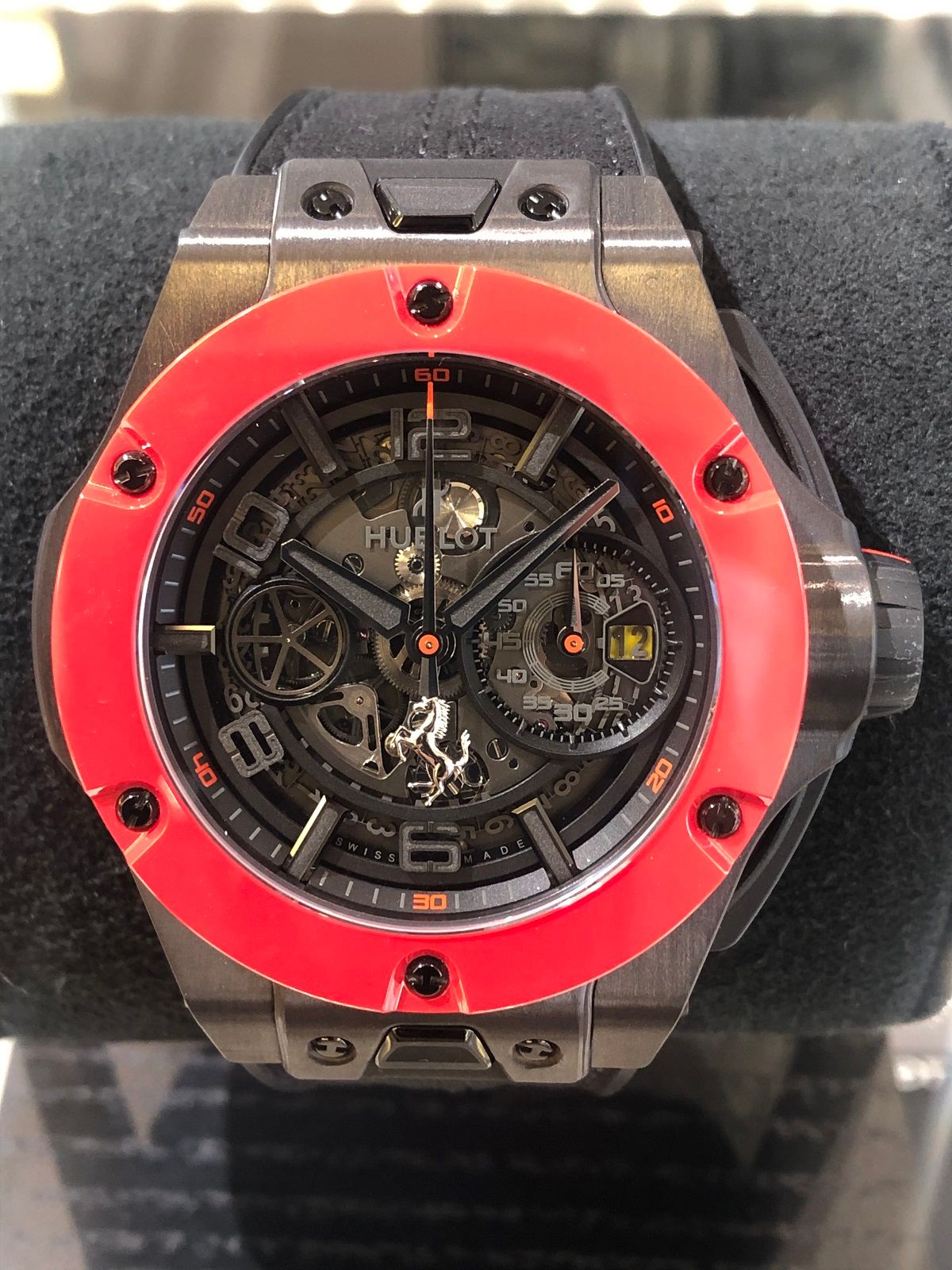 早川『これは ウブロ ビッグバン フェラーリ ウニコ カーボン レッドセラミック というモデルです‼ フェラーリレッドを彷彿とさせる赤いセラミックベゼルが目を引いてカッコイイですよね‼』