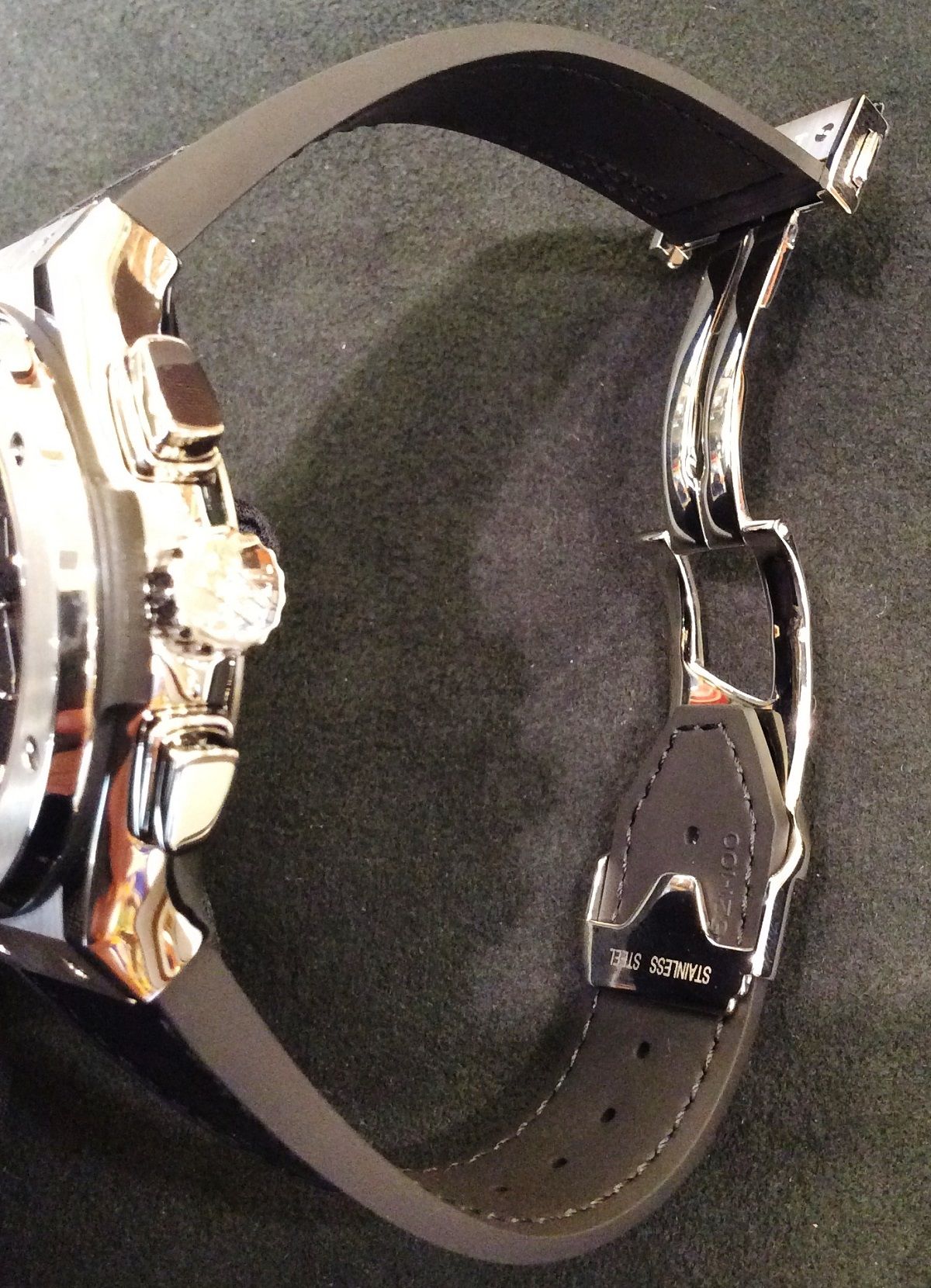 今回、ご紹介のクラシック・フュージョン クロノグラフのバンドは表に本革アリゲーターを用い、裏側はラバーと、レザーバンドはカッコイイけど汗が心配とおっしゃられる方々にも強い味方です!!