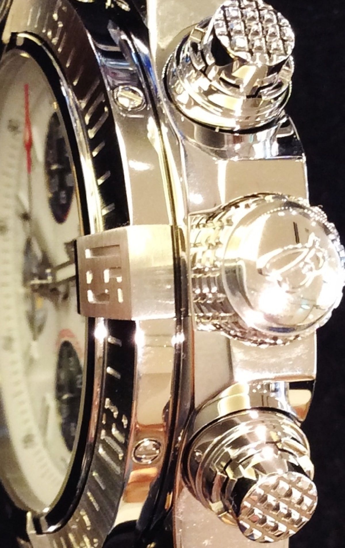 サイドから分かるようにアベンジャーⅡの特徴でもある、操作性の高い大きめリューズにプッシュボタンとこのモデルのカッコ良さ表す上で外せないポイントです!!