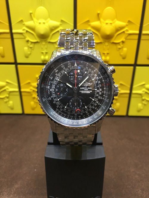 ナビタイマーシリーズでは珍しいオールブラックの文字盤で通常モデルとは違う精悍な顔つきで、日付表示の為の三日月型の針もアクセントになっています!