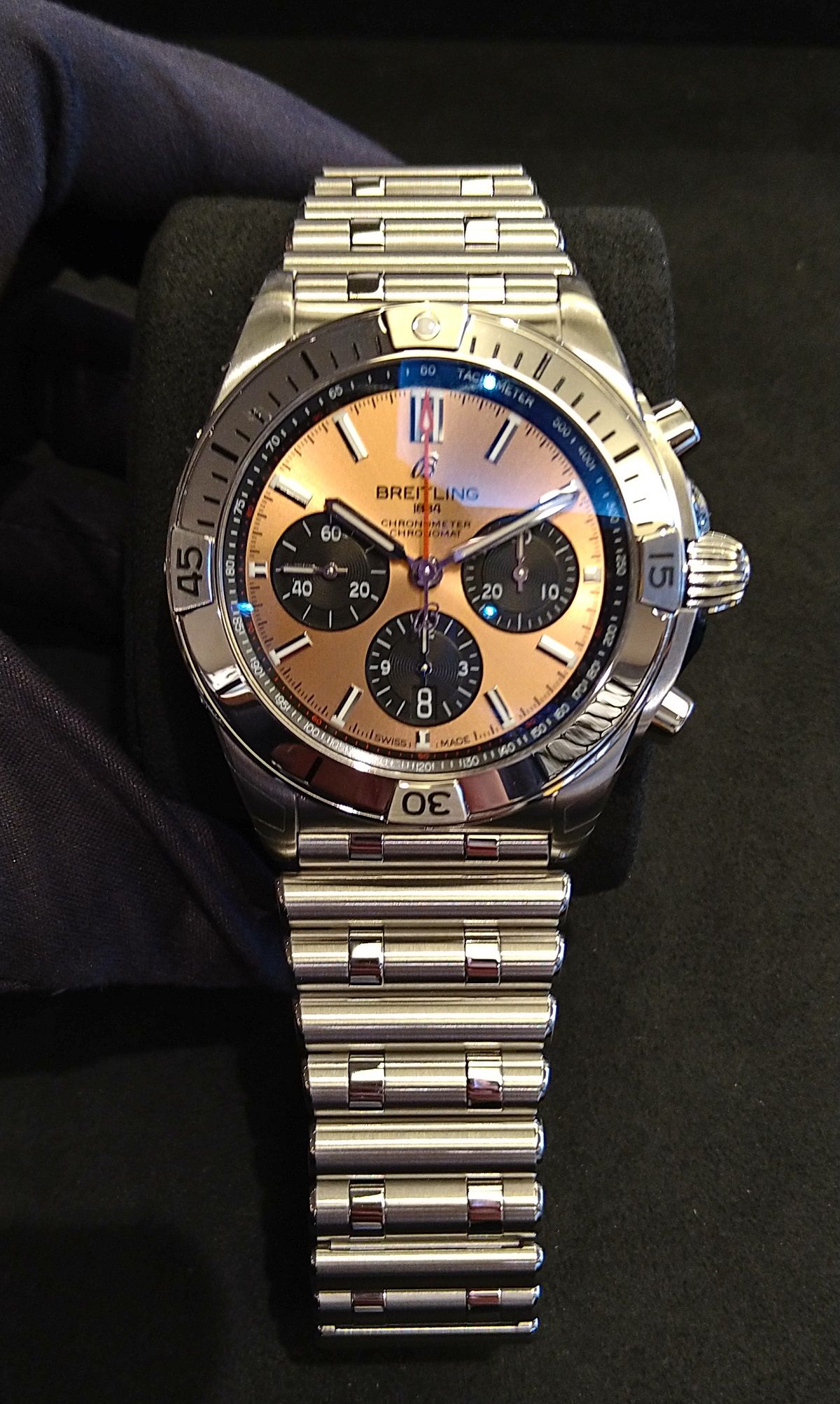 18Kレッドゴールドの文字盤が特徴のクロノマットです。
