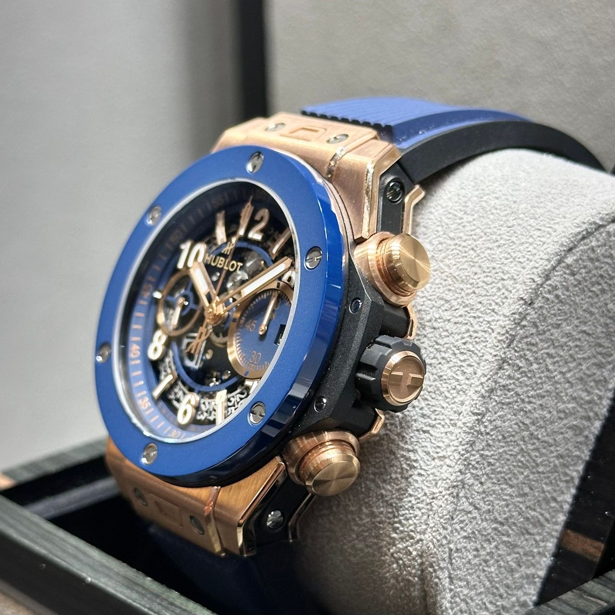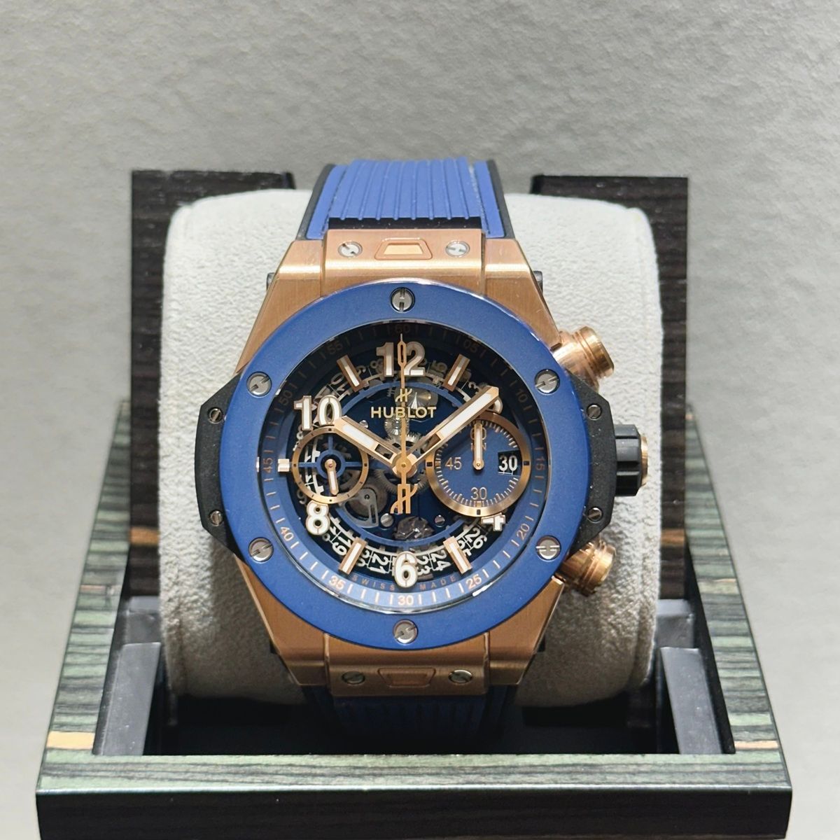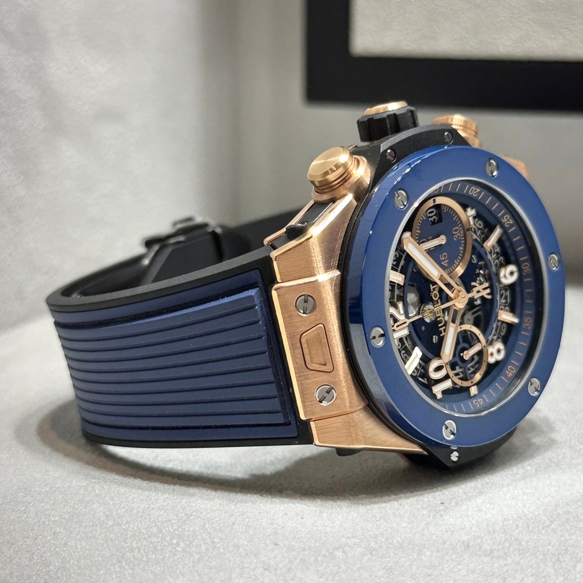 そんな皆様に愛されているビッグバンですが、本日紹介するこちらの時計は、キングゴールド×ブルーラバーのHUBLOTらしい異素材を融合したデザインのモデルです!