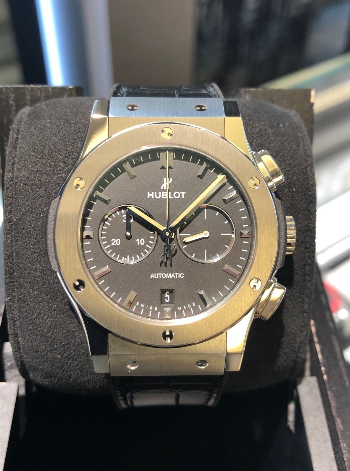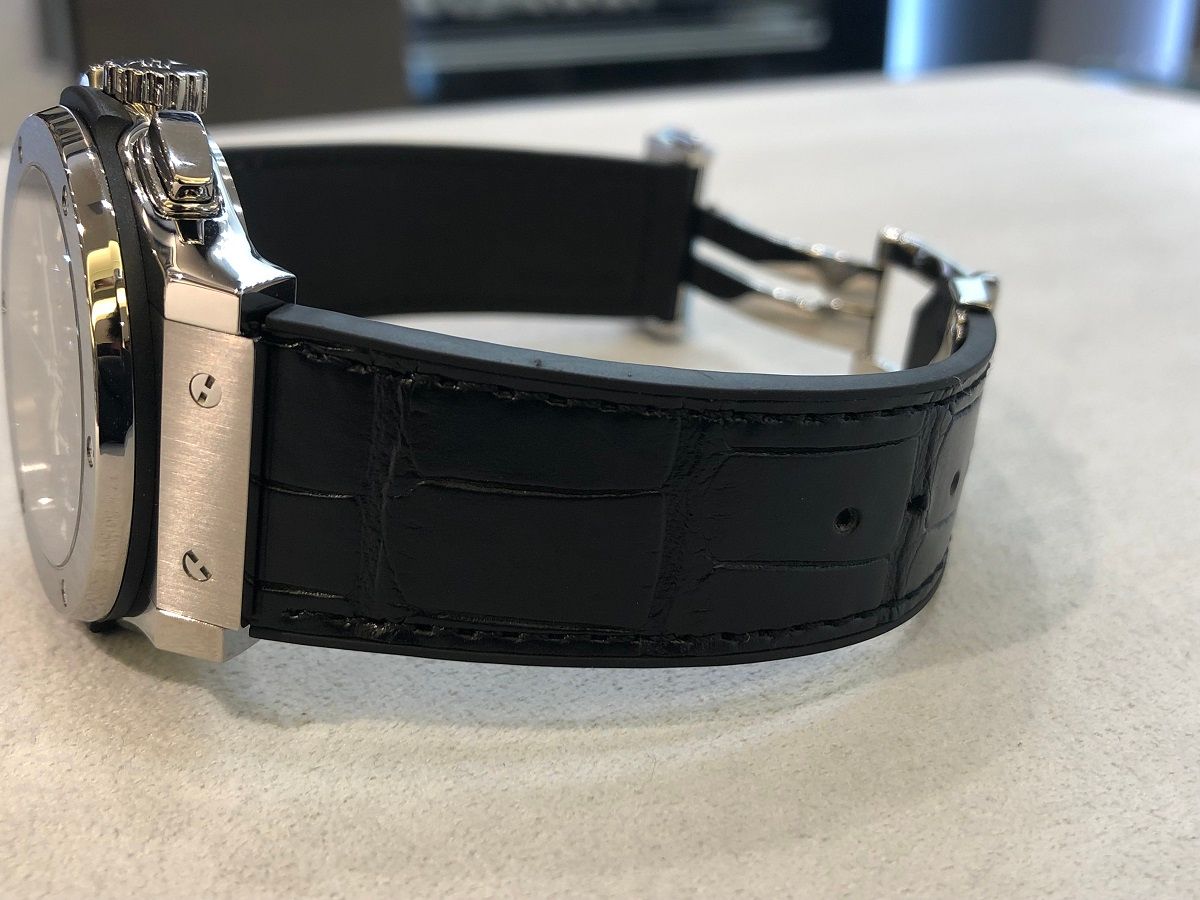 落ち着いたカラーリングですが、ケース素材がチタニウム、ストラップは表がアリゲーターと裏がラバーとなっており、ウブロのテーマであるフュージョン(融合)を体現したモデル!!