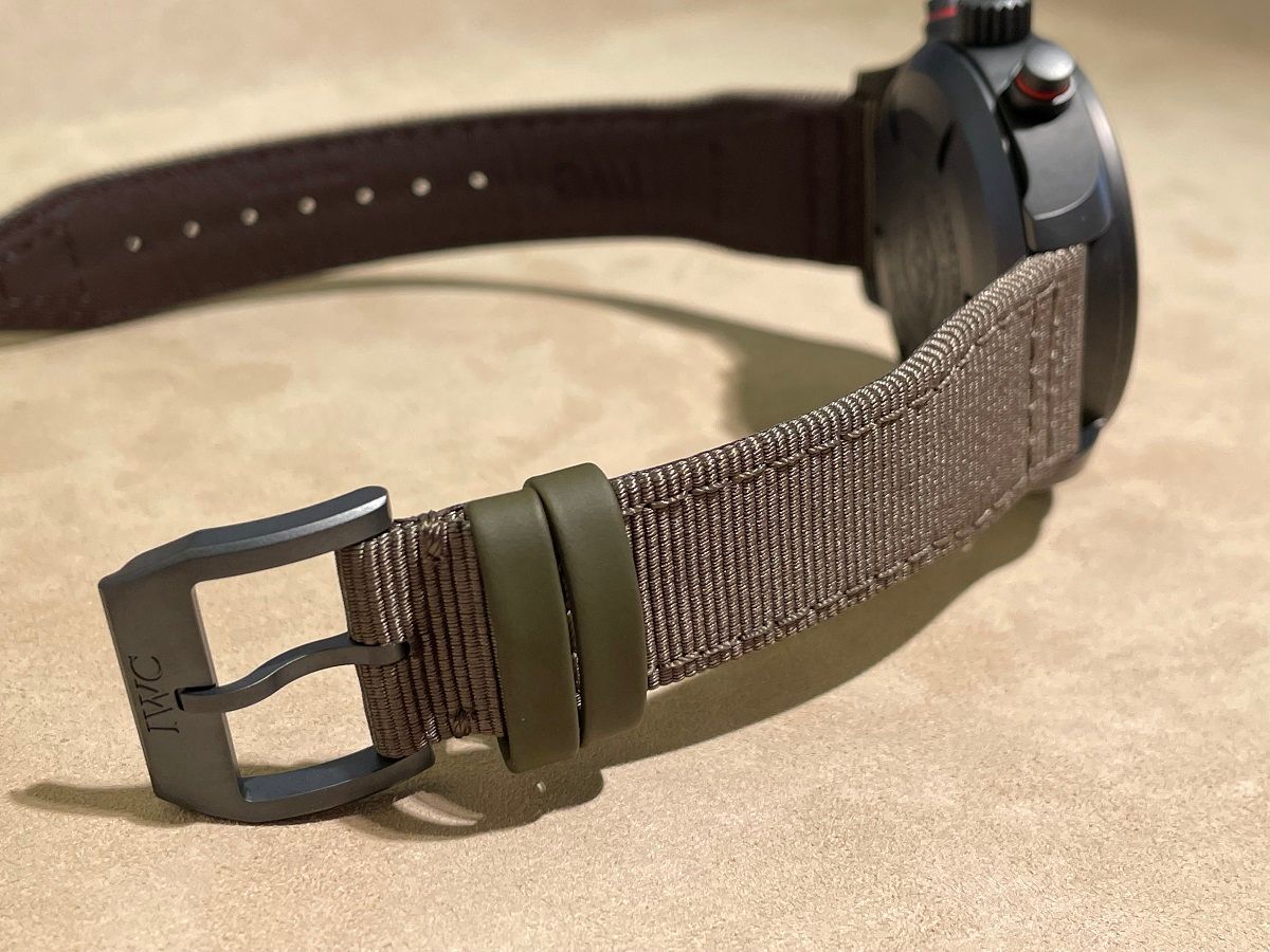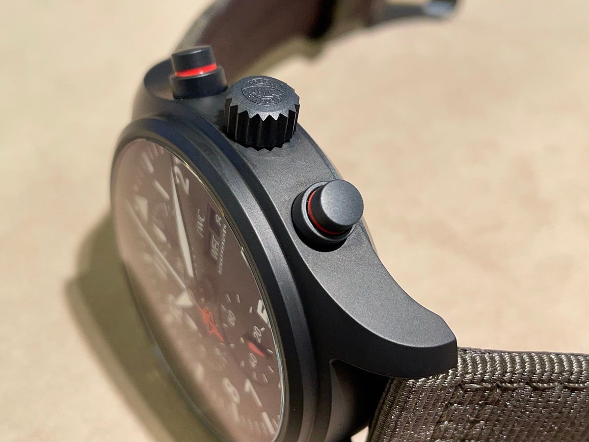 セラミックの中でも最強の強度を誇る酸化ジルコニウムセラミックをケース素材に採用し、プッシュボタンやケースバックにはIWCの新開発素材であるセラタニウムが使用されています。