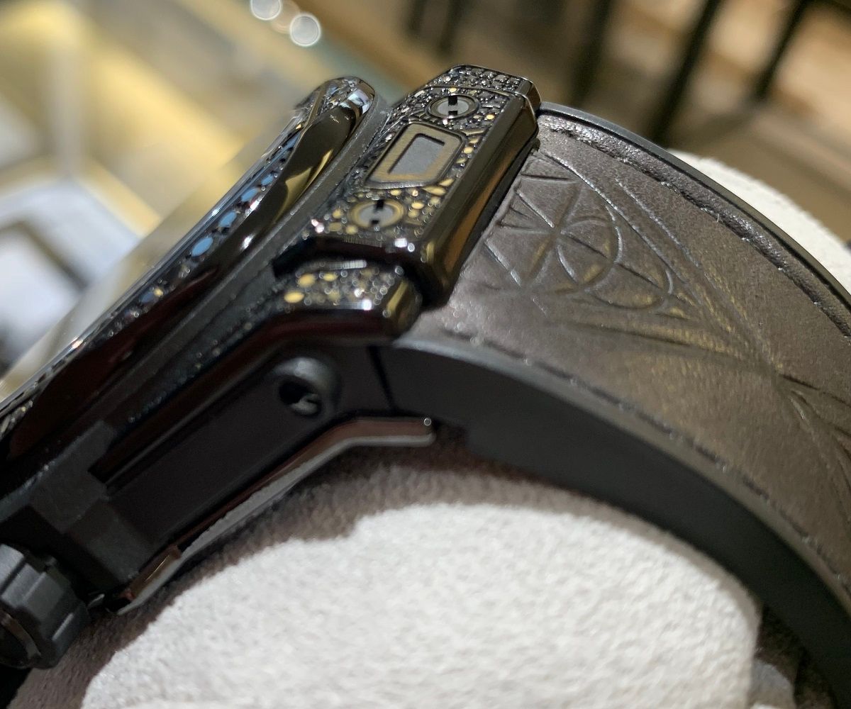 様々なサイズのブラックダイヤがベゼルにセッティングされていて高級感抜群です。