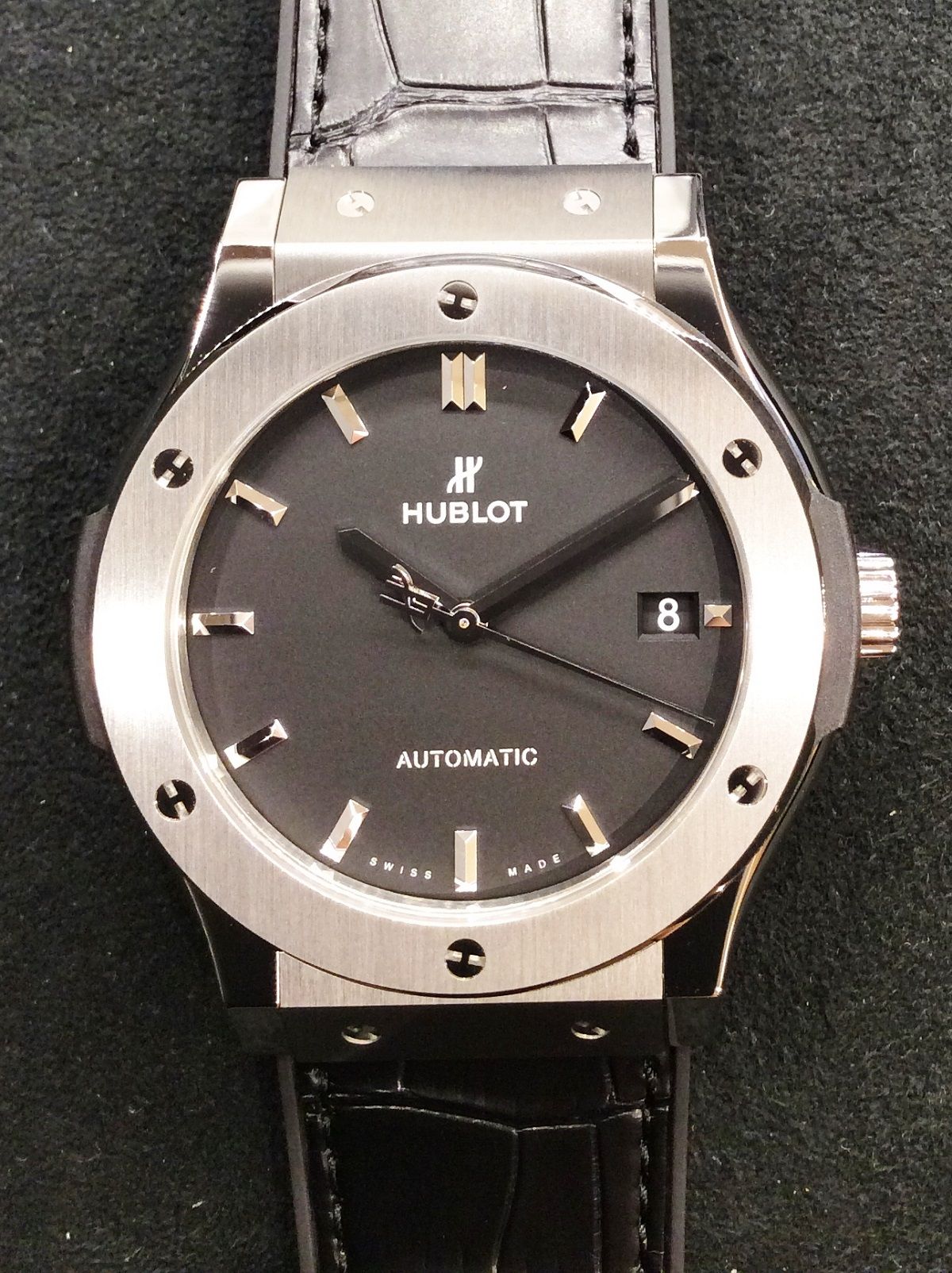 シンプルなデザインにチタンケースの輝き、軽さとカッコ良さも手伝い、どんなシチュエーションでも使えるウブロとして、皆様に選んで頂いております!!