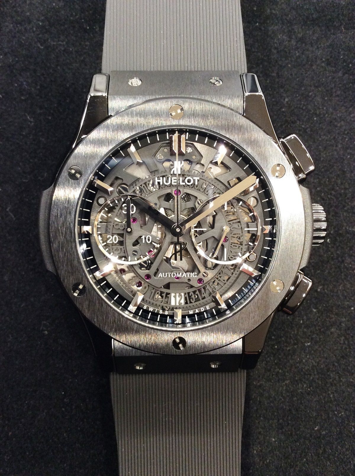 文字盤はウブロが得意とするスケルトン文字盤になっており、ケースの裏側がスケルトンになっていることは多いですが、前面からもアエロ・フュージョンのメカニカルな動きを楽しんで頂けます!!