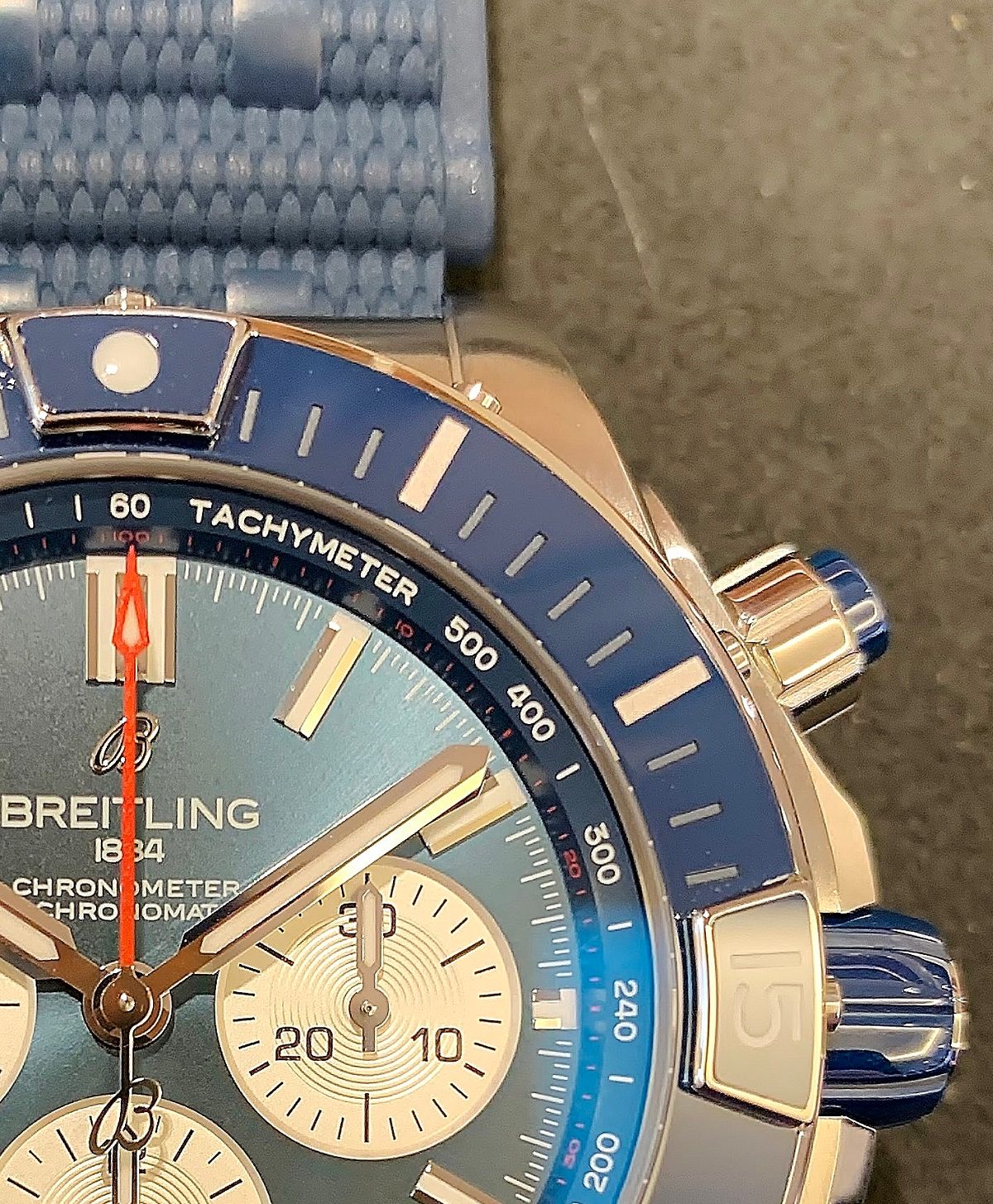 今回ご紹介のモデルは、ベゼル、リューズ、プッシュボタンにブルーセラミックが使われており、近年のクロノマットには無かった仕様が特徴!!