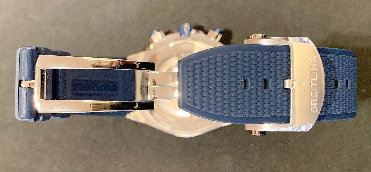 今回のモデルの仕様はストラップがブルーのラバーストラップにプッシュボタン式片開きフォールディングバックルが採用されており、金属ストラップも良いんですが、この仕様は見た目も軽快に、着脱も軽快になりますので、年中仕様にもオススメです!!