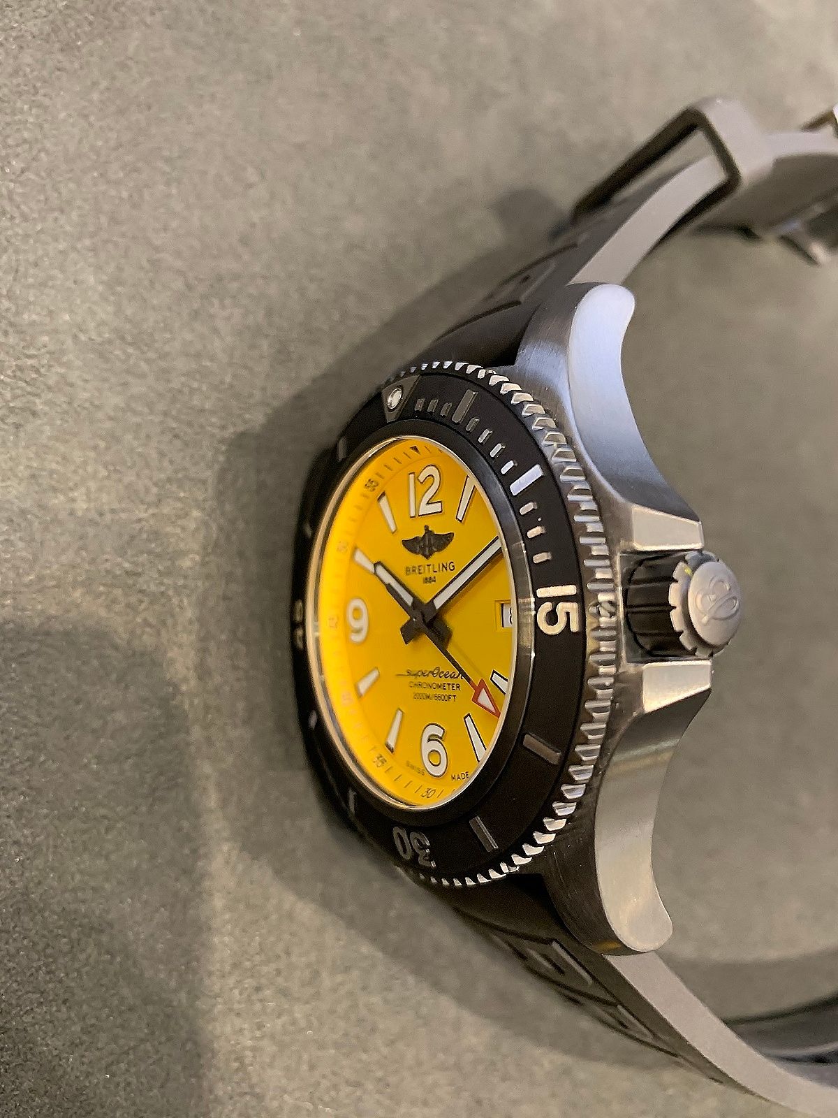 ブラックのケースに黄色の文字盤が、ステンレスシルバーをまとったスーパーオーシャンコレクションとは違ったカッコ良さを見せてくれます!!