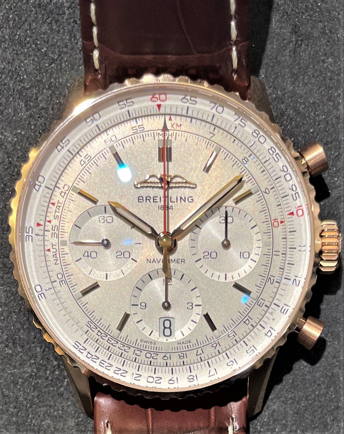 今回の新ナビタイマーは41ミリケースサイズで、装着感や見た目の大きさも良く、他展開サイズの46ミリや43ミリと比べてもナビタイマー感は損なわれることなく、使い易いサイズと自社ムーブメント搭載にて生まれ変わりました‼