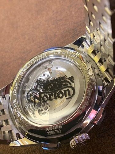 裏蓋はシースルーバックになっており、ノートンのバイクとロゴがプリントされております。