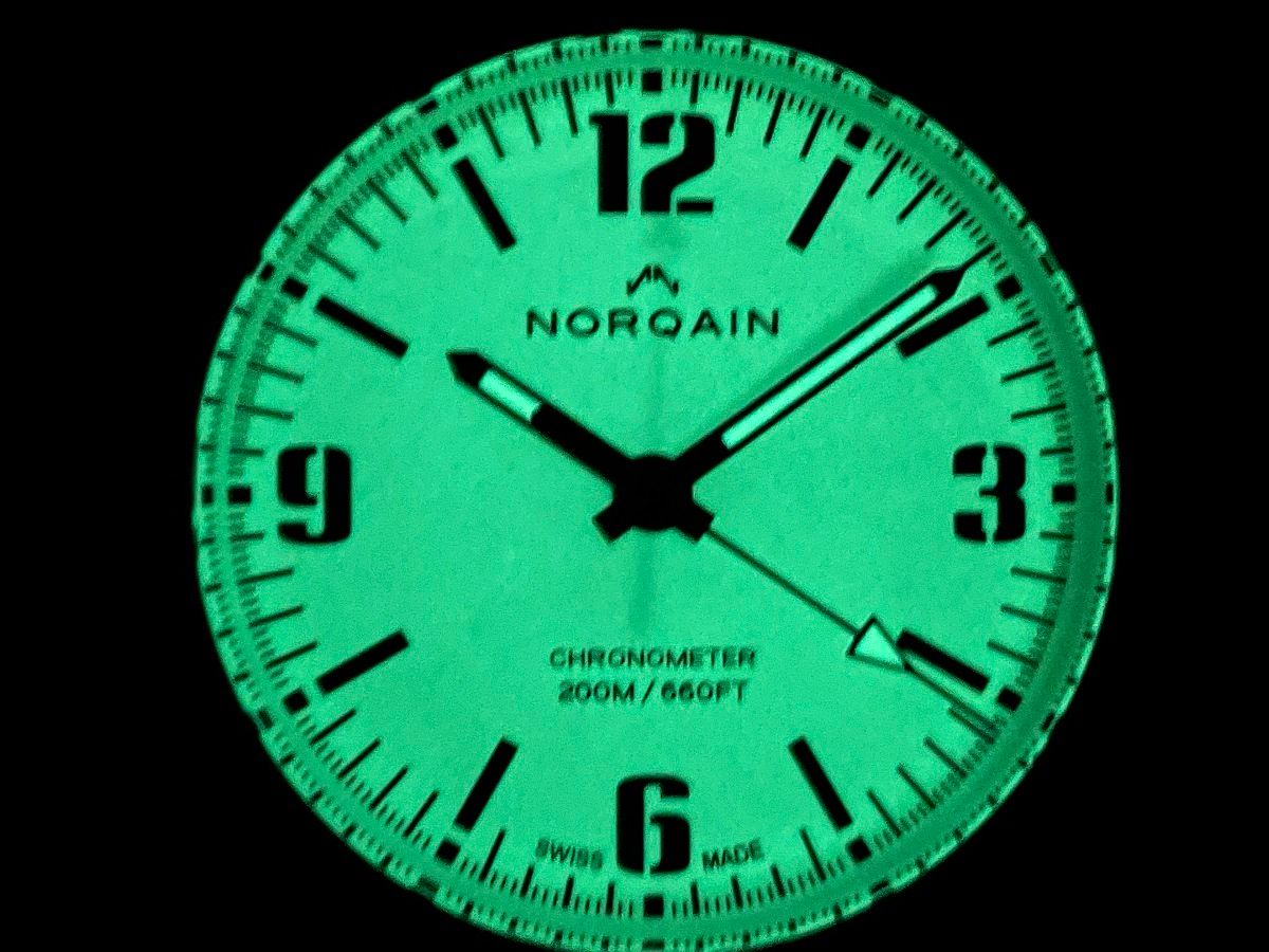 針に使用している蓄光塗料《X1 スーパールミノバ》を文字盤にも使用しており、夜になると…