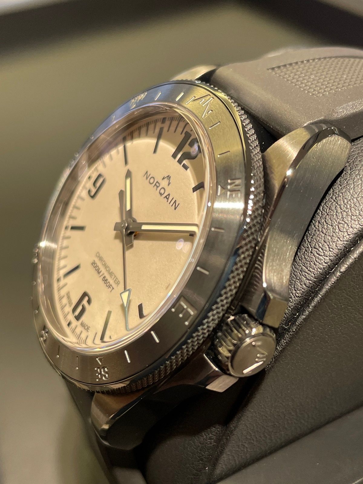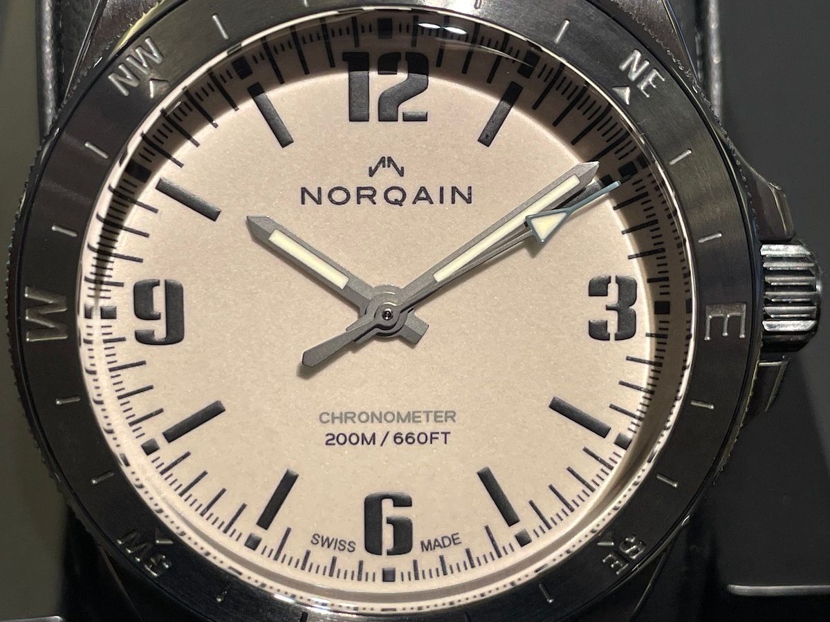 ベゼルは両回転式で、よく見ると東西南北を示す刻印のうち北の部分にはノルケインのロゴが。