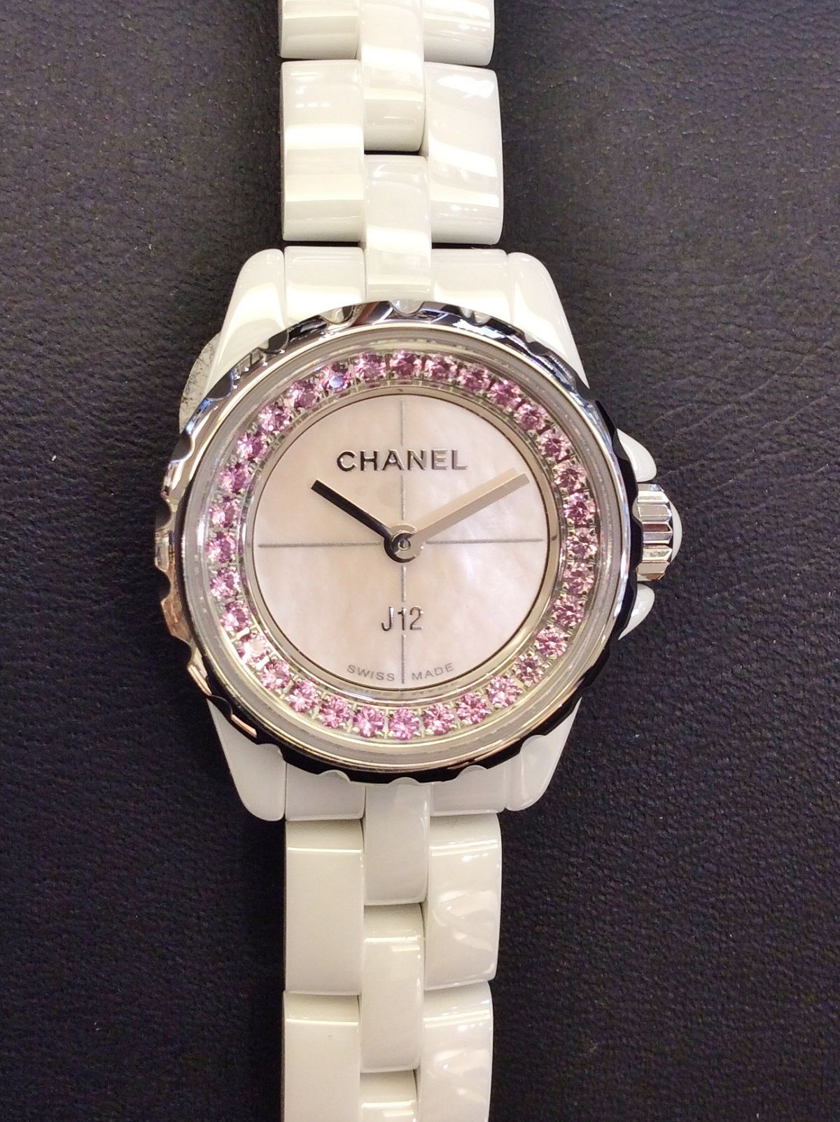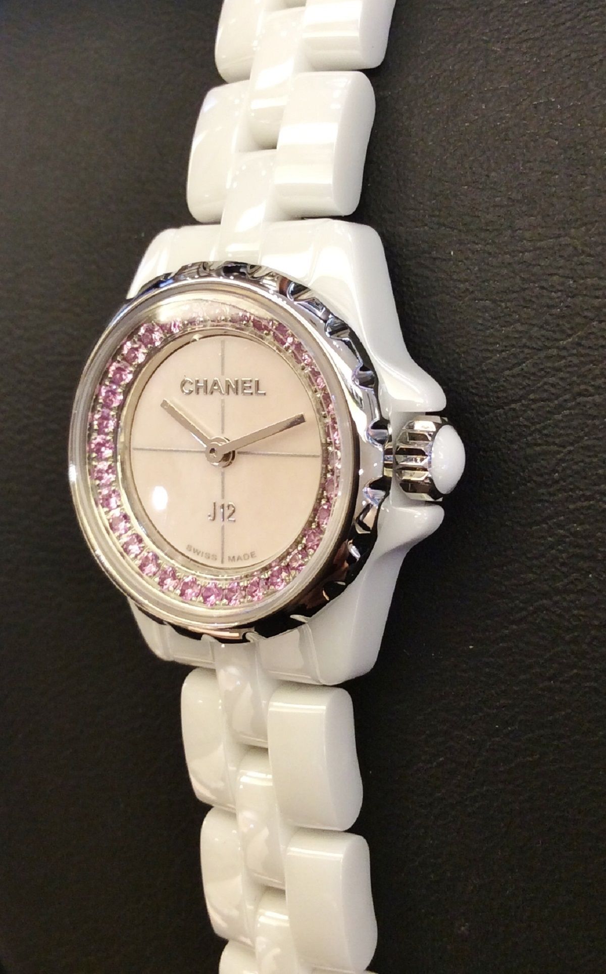 J12コレクションの中では最小の19ミリホワイトハイテクセラミックケースにピンク のマザー オブ パールを文字盤に使用し、その周りを32個ピンクサファイアで飾った可愛らしく、華やかな新作!!