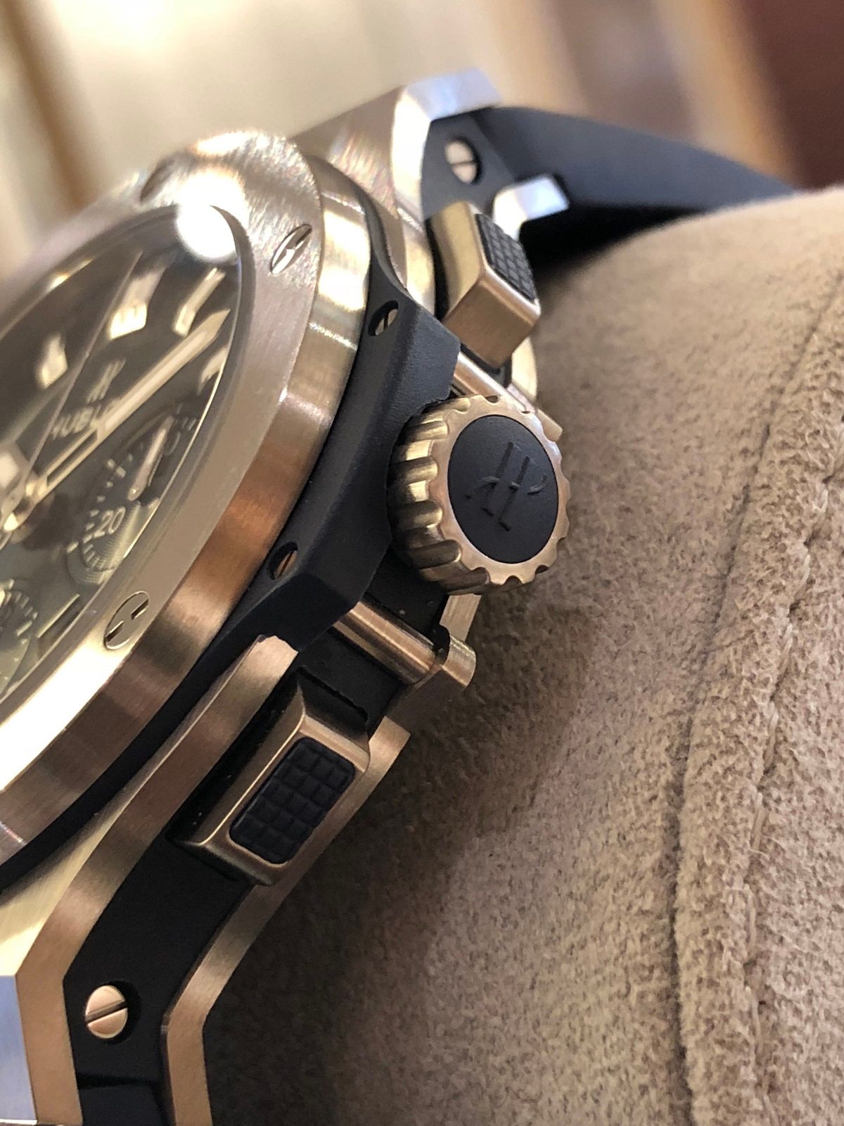 サイドはサンドウィッチ構造なので、遠目から見てもウブロだと分かるほどの圧倒的な存在感!