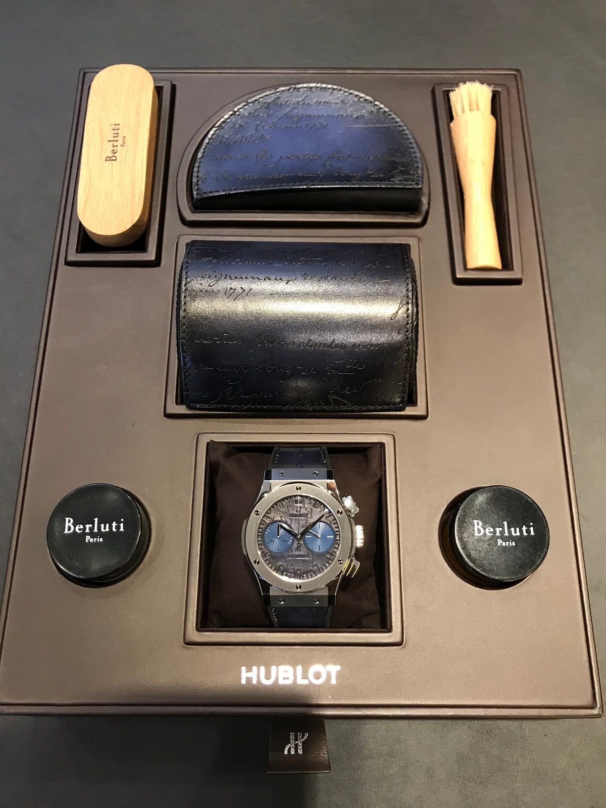 時計を収納するボックスもベルルッティ仕様となり、その中には・・・