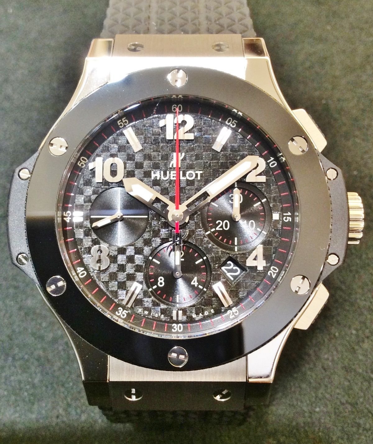 カーボン文字盤にクロノグラフの赤い針、ブラックセラミックを使ったベゼル部分とスポーティさの際立つかっこいいモデル!!