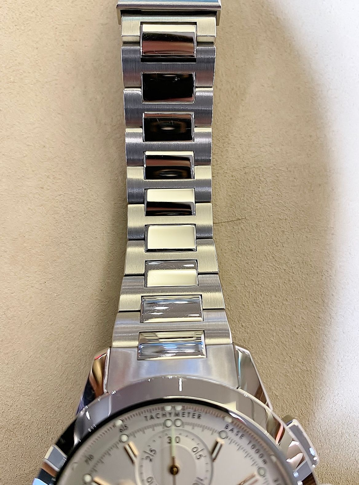 IWCはレザーストラップの印象が強いブランドですが、このインヂュニア・クロノグラフには磨きと非磨きのコントラストが綺麗で高級感のあるステンレススチール製金属ブレスが装着されています!!